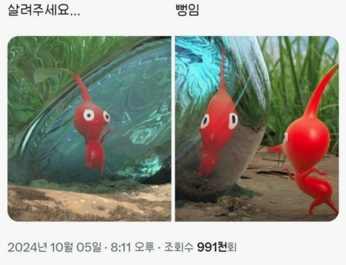 색색깔의 피크민 캐릭터 자체가 귀엽다는 반응도 많습니다. 피크민 캐릭터와 세계관은 SNS에서도 각종 밈으로 사용되고되고 있어요. 색상별 피크민에 각각의 성격을 부여하기도 하고, 제목을 붙여 웃긴 짤로 사용하기도 하죠. 해당 밈들이 SNS를 통해 바이럴되며 피크민 블룸의 유행이 더욱 더 퍼져나가기도 했습니다.