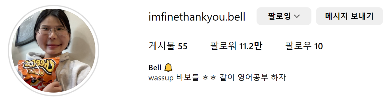 ✔️ 영어 콘텐츠 포화시대에서 본인만의 차별화 포인트를 살린 영어 공부 릴스로 '아임파인땡큐벨'이 떡상하고 있어요.