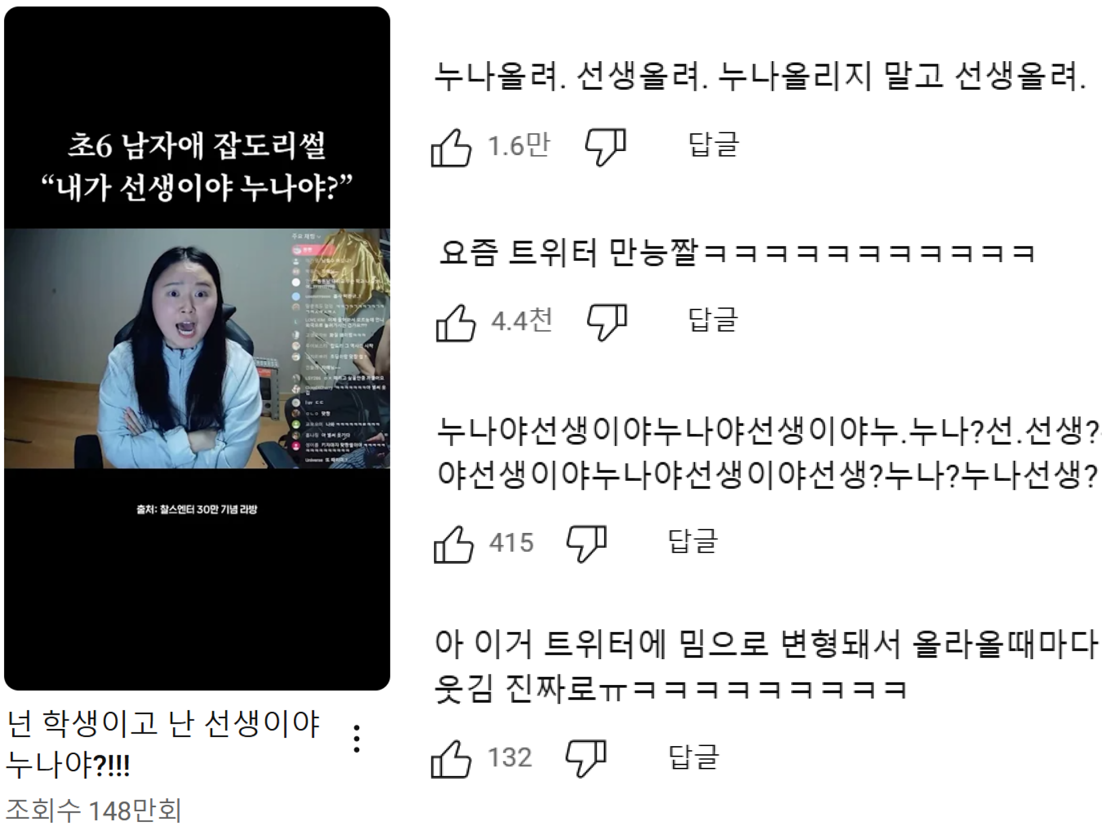 찰스엔터가 초등학교 6학년 학생들을 가르치다가 가장 말 안 듣는 학생을 호명해서 '너 내가 선생이야 누나야?' 라고 물었다고 해요. 학생이 '선생님이요'라고 하자 찰스엔터가 '누나잖아! 너가 나를 누나로 대하고 있잖아'라고 말하며 자신을 선생님으로 대하지 않는다고 혼낸 것인데요. 그 후 '내가 선생이야 누나야'라는 질문을 답정너처럼 반복하다가 결국 학생이 헷갈려서 '누나?'라고 말하자 '선생이잖아!!!!!'라고 화낸 썰이랍니다.