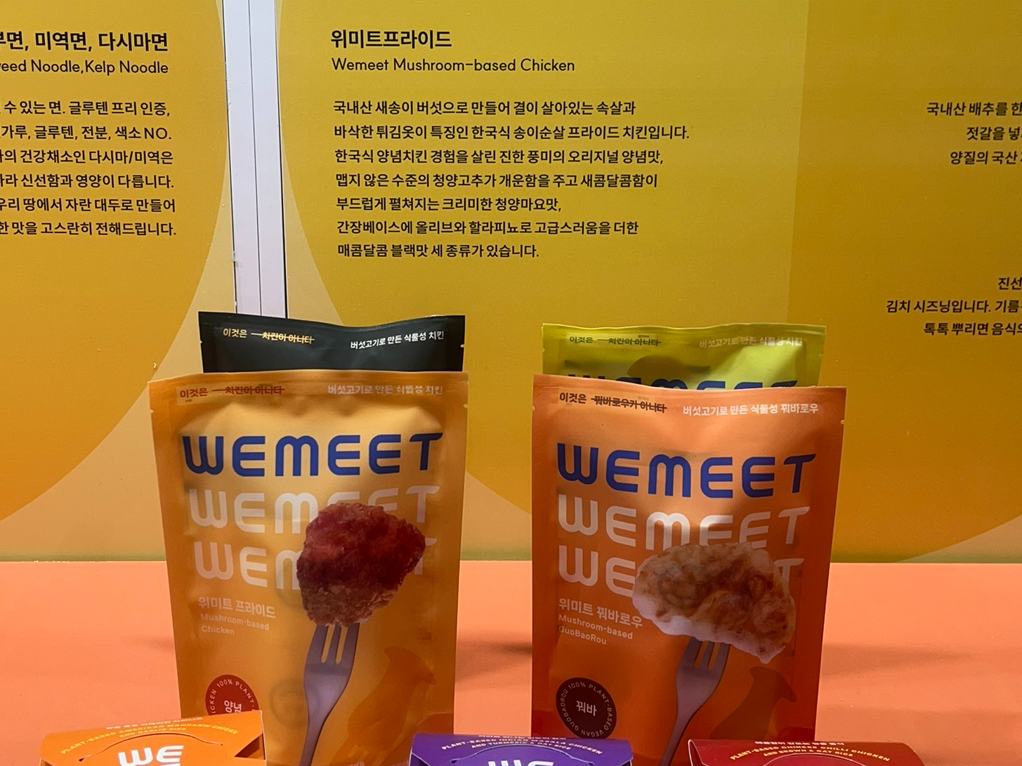 이번 박람회에서는 그 뒤를 이어, 우리의 식물성 식문화를 더 즐겁게 만들어줄 새로운 브랜드를 만날 수 있었답니다! 바로 100% 식물성을 원칙으로 미식의 즐거움과 건강함을 전하는 브랜드, '위미트'인데요. 위미트의 '위미트프라이'는 국내산 새송이버섯을 활용하여 '한국식 송이순살 프라이드 치킨'을 출시했어요. 이렇게 버섯 고기를 활용한 프라이드 치킨 제품은 국내 최초라고 하는데요. 특히 양념 소스, 청양 소스, 블랙 소스까지 다양한 맛으로 출시돼 먹는 재미가 더해졌답니다. (이 중 양념과 청양 맛은 소스까지 100% 식물성이라고 해요)