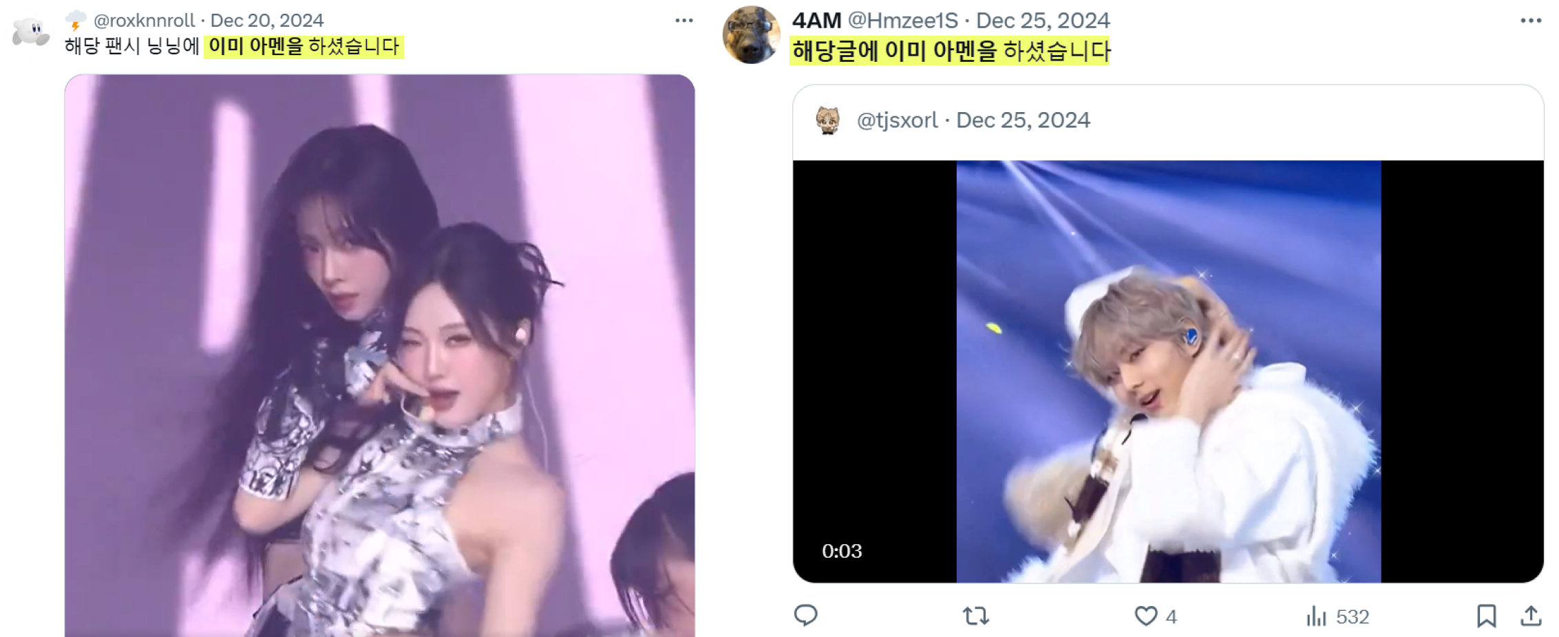 최근 핫한 주접멘트는 '이미 아멘을 하셨습니다'입니다. 여러 X 유저들이 본인이 덕질하는 아이돌의 콘텐츠를 올리며 아멘을 외치고 있는데요. 웬 아멘이냐고요? 내가 좋아하는 아이돌의 얼굴이 그저 아멘을 불러 일으키기 때문이죠.
