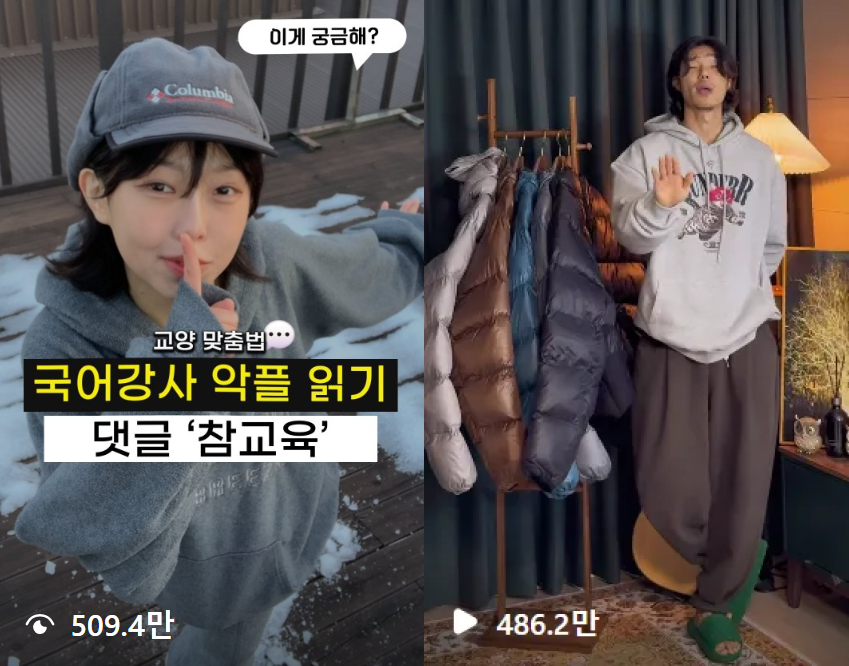 어려울 수 있는 시사/책/맞춤법 등의 주제를 국어강사로서 쉽게 풀어내는 인플루언서 '밍찌'는 웨잇 챌린지를 악플 읽기 콘텐츠와 합쳐서 센스 있게 악플러들에게 일침을 놓는 콘텐츠를 만들어 냈어요. 이뿐만 아니라 패션을 주제로 여러 숏폼 콘텐츠를 만들어 내는 '비르'는 룩북 콘텐츠에 웨잇 챌린지를 녹여서 단조로울 수 있는 룩 소개를 재밌게 표현했답니다.