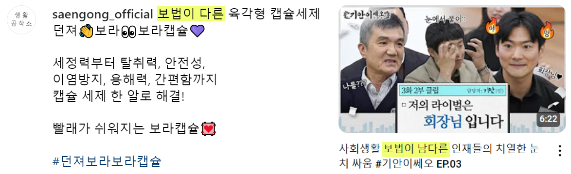 보법이 다름은 이제 커뮤니티를 넘어 다양한 곳에서 활용되고 있습니다. 생활공작소는 자사의 캡슐 세제의 성능을 강조하기 위해 인스타그램에 보법이 다르다는 말을 사용했어요. LG 유플러스에서 운영하고 있는 미디어 채널인 스튜디오 엑스에서는 최근 기안이쎄오라는 오리지널 콘텐츠 관련 영상을 업로드했는데요. 이 때 보법이 남다른이라는 표현을 써서 영상의 주목도를 높였답니다. 밈은 사용하고 싶은데 적절한 멘트를 찾지 못하고 있었다면 위 사례들처럼 '보법이 다름'을 활용해보는 건 어떨까요?