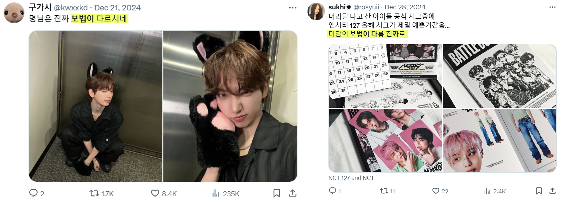 ✔️ X(트위터)에서는 좋아하는 아이돌을 덕질하기 위해 다양한 주접멘트 밈을 사용하고 있어요.