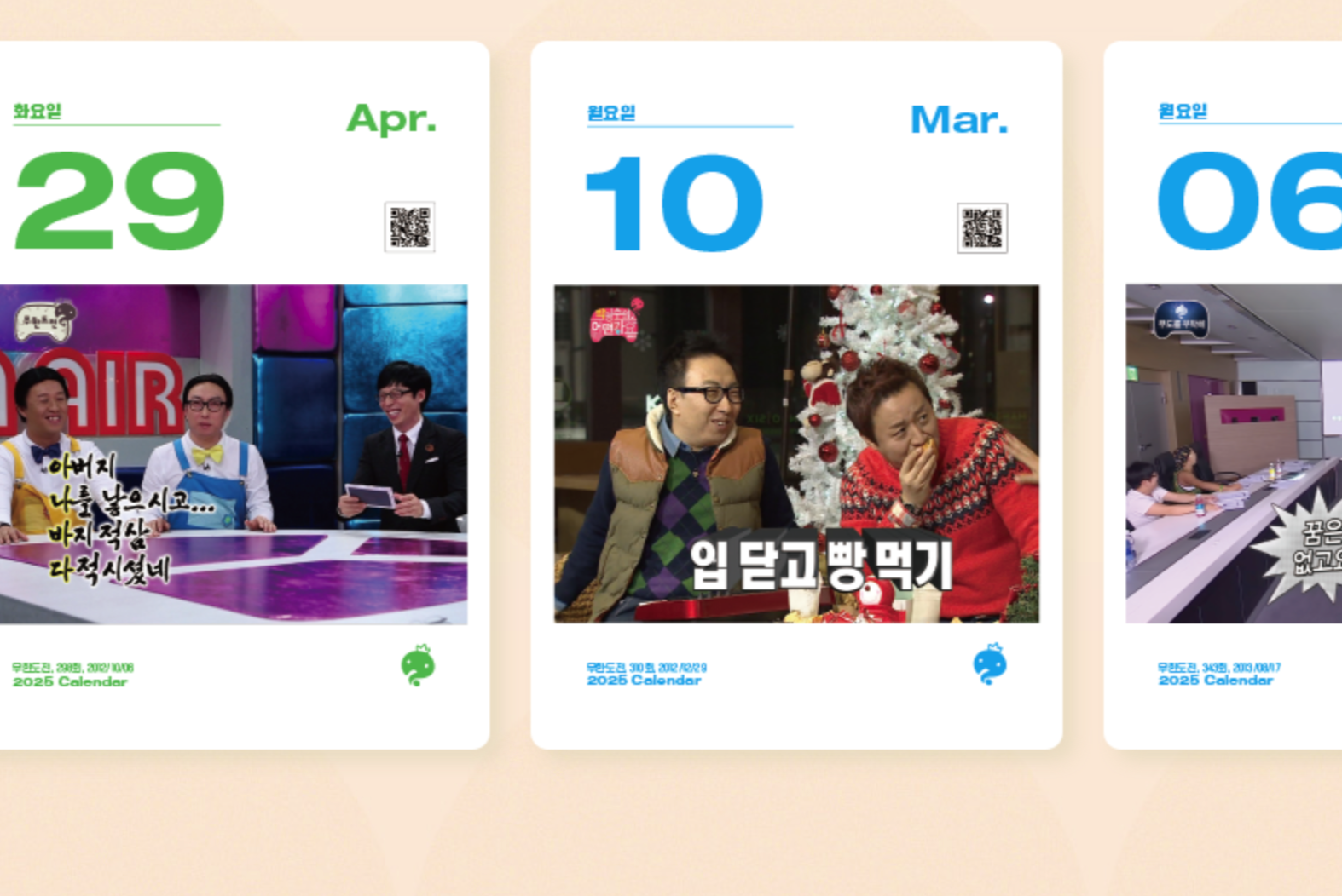 월 단위인 달력과 달리 일력을 하루하루 넘기는 일 단위입니다. 매일 아침 다음 장으로 넘기며 하루를 새롭게 시작하는 기분을 매일 얻을 수 있다는 이점이 있죠. 이번 무한도전 일력에는 지금까지도 일상 속에서 자주 쓰이는 무한도전의 대표 '밈'들로 구성되어있어요.