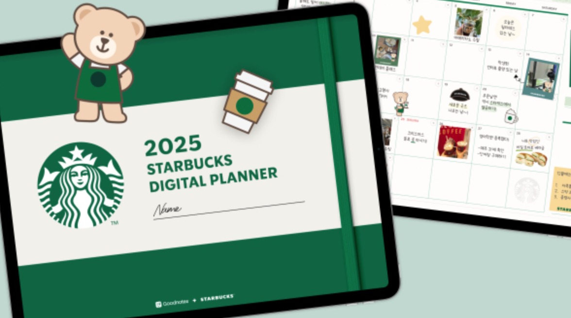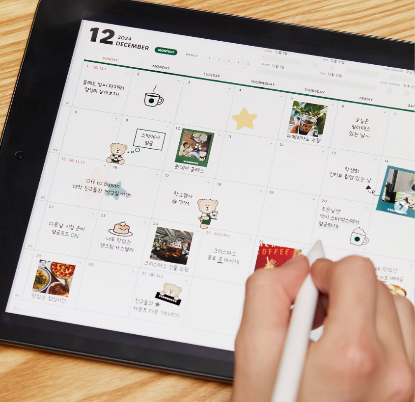 이번 스타벅스 디지털 플래너는 전세계적으로 사용되는 필기앱인 '굿노트(Goodnotes)'와 함께 만들었습니다. 스타벅스 다이어리인 만큼, 스타벅스 음료와 디저트를 이모티콘, 스티커처럼 만들어 캘린더에 이미지를 첨부하며 '다꾸'할 수 있도록 했어요.