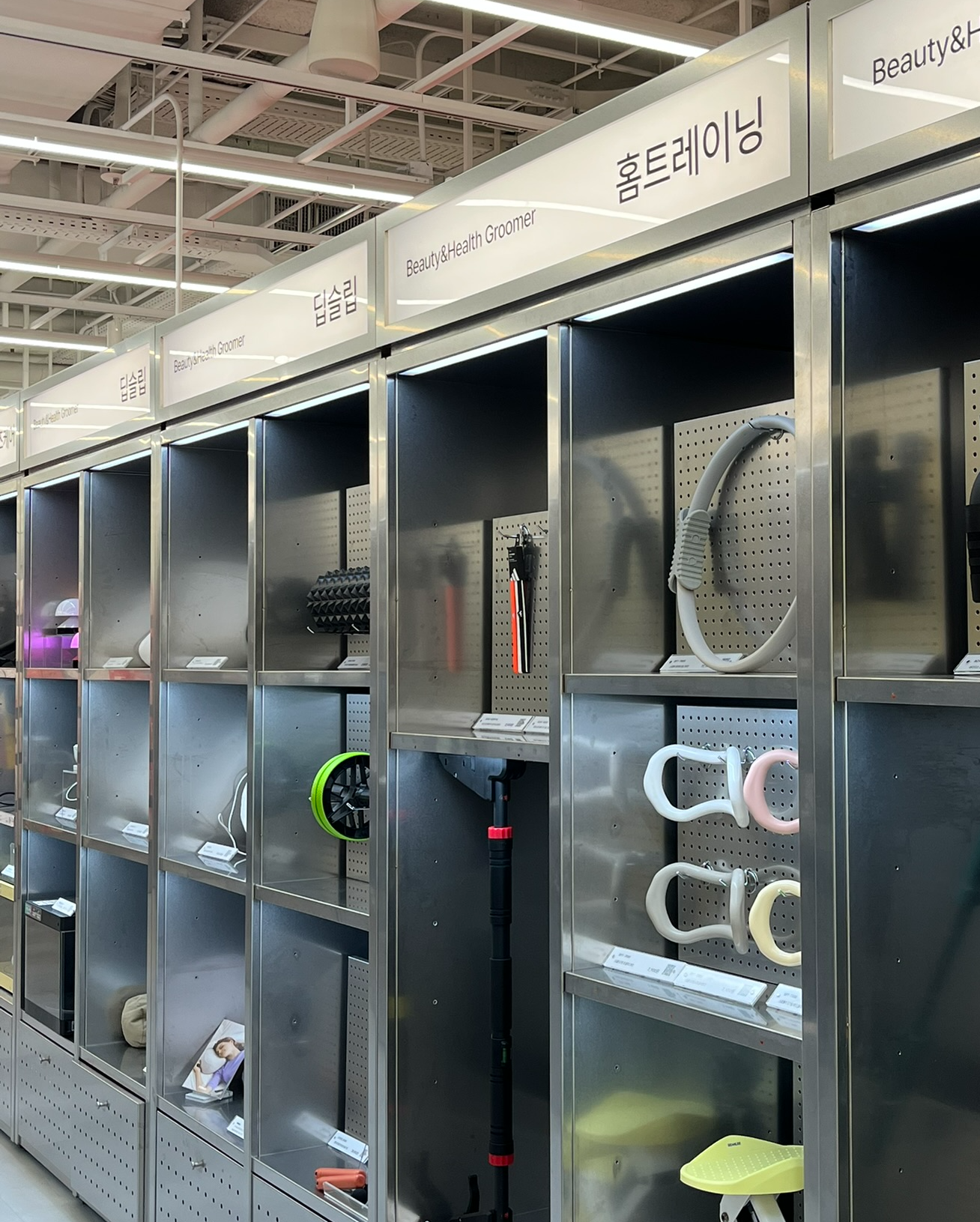 전시 공간을 모두 둘러본 후엔 매장을 살펴봐야겠죠? 이 판매 공간의 이름은 '큐레이션 라이브러리'. 일반적으로 떠올리던 가전 양판점의 진열 방식과는 다른 첫인상이 보이죠. '홈 트레이닝', '딥슬립', '디자인 조명' 등 세분화된 키워드에 따라 제품들을 제안하고 있는데요. 고객들은 자유롭게 제품을 체험하고, QR 코드를 스캔해 제품 정보 확인이나 구매를 할 수 있습니다. 현장 구매를 원할 때에만 직원을 부르면 되며, 'QR로 소통하는 더 나노 스퀘어'라는 안내문을 붙여 타깃 특성에 맞춘 비대면 중심의 쇼핑 경험을 제공합니다. 상품 구성은 1인 의류 관리기, 스마트 휴지통, 레트로 CD 플레이어, 타투 프린터, 게임용 단축키 키보드 등 이색적이고 트렌디한 상품, 디자인을 강화한 소형 가전 등으로 채워져 있어 '1인 가구 가전 편집샵' 으로서의 정체성을 선명히 느낄 수 있었답니다.