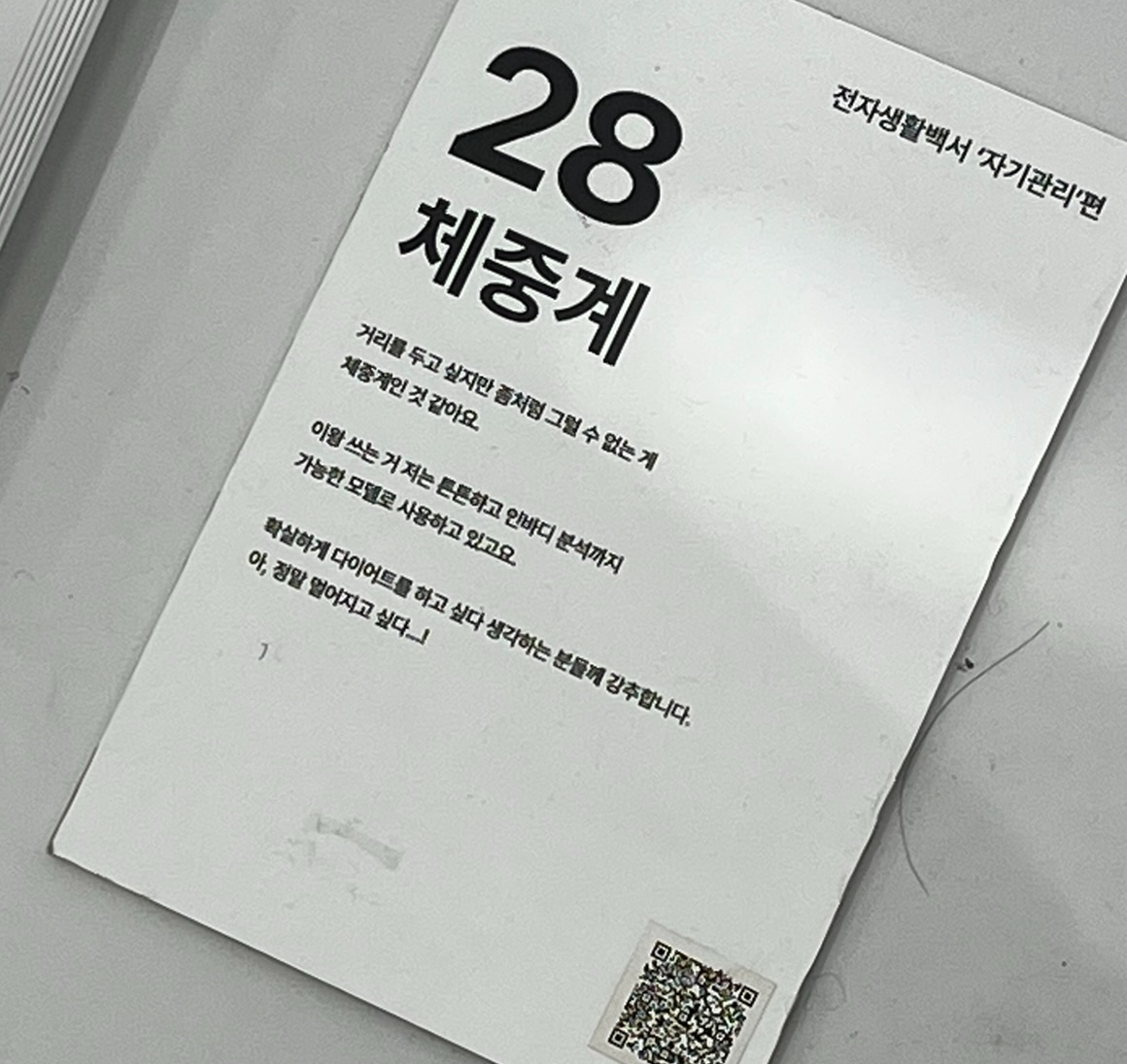 '사실 가장 귀찮은 집안일을 꼽으라면 설거지예요', '거리를 두고 싶지만 그럴 수 없는 게 체중계인 것 같아요. 이왕 쓰는 거 튼튼하고 인바디 분석까지 가능한 모델로 사용하고 있고요'. 이처럼 충분히 공감 가는 일상의 이야기를 듣고 호기심이 생긴다면, QR코드를 찍어 제품 정보를 확인할 수 있습니다. 'QR 코드를 찍어 더 자세한 정보를 확인해 보세요' 등의 멘트도 정말 드물게 배치돼 있어 인위적인 강요를 느끼기 어렵습니다. 제품을 판매하는 플랫폼에서 브랜드/제품명을 뺀 과감한 시도를 통해, 때로는 덜어낼 때 설득력이 더해지고 자발적 탐색을 이끌 수 있음을 깨닫게 됩니다.