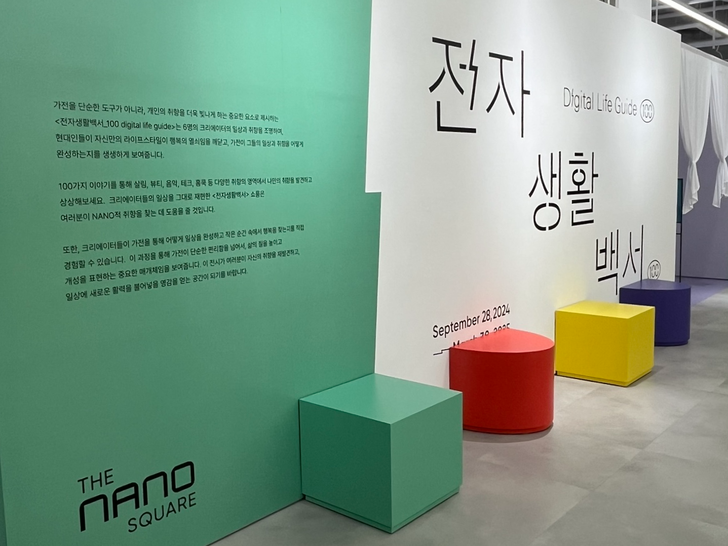매장에서 열리고 있는 전시회의 이름은 <전자 생활 백서_100 digital life guide>. 각양각색 6인의 크리에이터 일상을 그대로 재현한 쇼룸으로 구성돼 있습니다. 홈 크리에이터 'H크리스탈', 뷰티 크리에이터 '시네', 싱어송라이터 '유라', 테크 크리에이터 '주연', 작가 '무과수', 패브릭 리사이클링 아티스트 '김은하' 까지. 살림, 뷰티, 음악, 테크, 홈쿡 등 다양한 취향을 가진 크리에이터가 전하는 100가지 키워드 스토리 텔링을 따라 가다 보면, 새로운 가전 활용법과 자신의 취향을 발견할 수 있는데요. 이를 통해 가전은 '개인의 취향을 더욱 빛나게 하는 중요한 요소'임을 전달하려 했답니다.