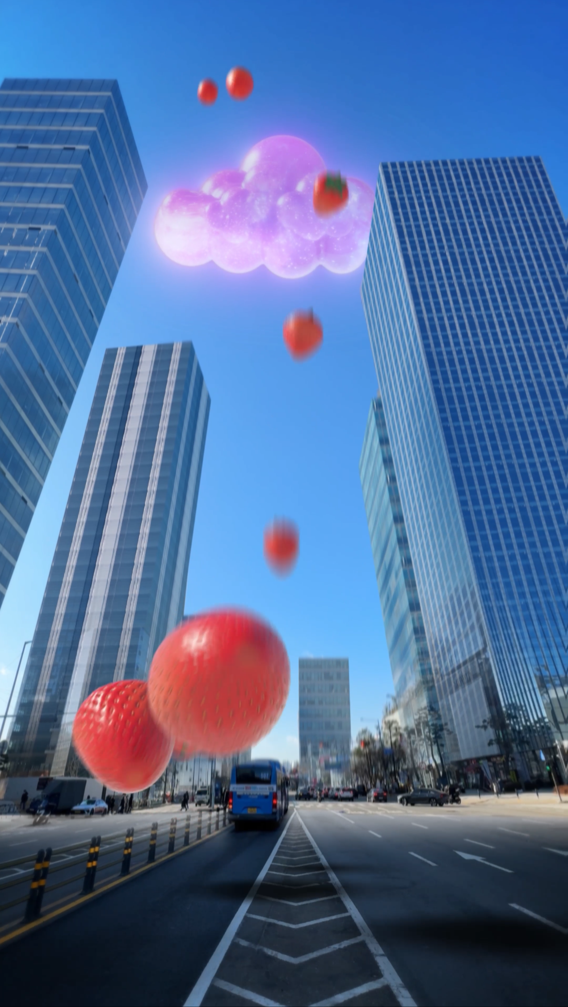 사실 이 초현실적인 장면은 메가MGC커피가 딸기 시즌을 맞아 선보인 FOOH 영상 콘텐츠의 한 장면이었습니다. 브랜드의 스테디셀러인 딸기라떼를 더욱 커진 대용량 ‘왕메가’ 사이즈로 출시하면서, 이를 소비자들에게 강렬히 알릴 캠페인으로 이 독특한 영상을 제작한 것이었어요.