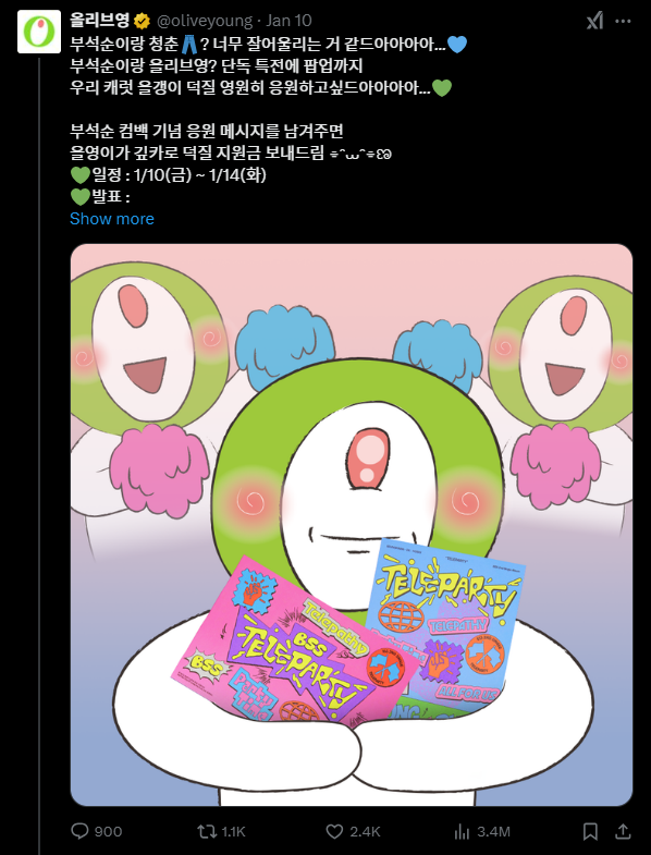 팬들의 주접 트윗을 인용하거나, 아티스트가 올리브영을 언급했을 때 이를 놓치지 않고 적극적으로 반응하고 있습니다. 또한, 팬덤을 겨냥한 다양한 이벤트를 통해 팬들을 올리브영의 팬 ‘올갱이’로 만들고 있죠.