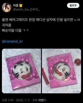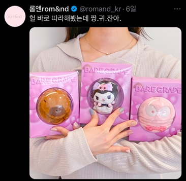 롬앤에서 판매한 ‘한정 에디션 패키지 박스’를 활용해 인형을 꾸민 팔로워의 게시물을 따라 하거나, 오징어 게임2 속 공기놀이를 따라 하는 방식으로 트렌드를 반영하고 있어요.