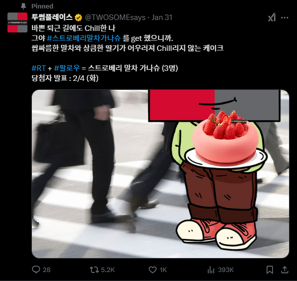 투썸플레이스는 인스타그램과 X에서 전혀 다른 방식으로 SNS를 운영하고 있어요. 인스타그램에서는 상세 이미지 컷과 같이 이상적인 제품 이미지를 중심으로 운영해요. 반면 X에서는 ‘겨울 제철 음식 : 스초생’ 같은 밈을 활용하며 가벼운 방식으로 홍보하죠.
