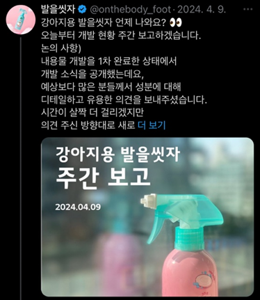 발을씻자는 ‘강아지용 발을씻자’ 상품을 개발하고 공개하는 과정에서 많은 견주의 의견과 피드백을 적극 반영했어요. 주간 보고 시리즈로 성분과 기능에 대해 3개월간 팔로워와 소통하며, 강아지에게 무해한 성분을 사용한 안전한 상품이라는 점을 강조할 수 있었습니다. ‘강아지용 발을씻자’ 제품을 판매한 이후에는 애완견 실종 글을 리트윗하거나 귀여운 강아지 사진을 공유하며 펫프렌들리한 면모를 보여주고 있어요.