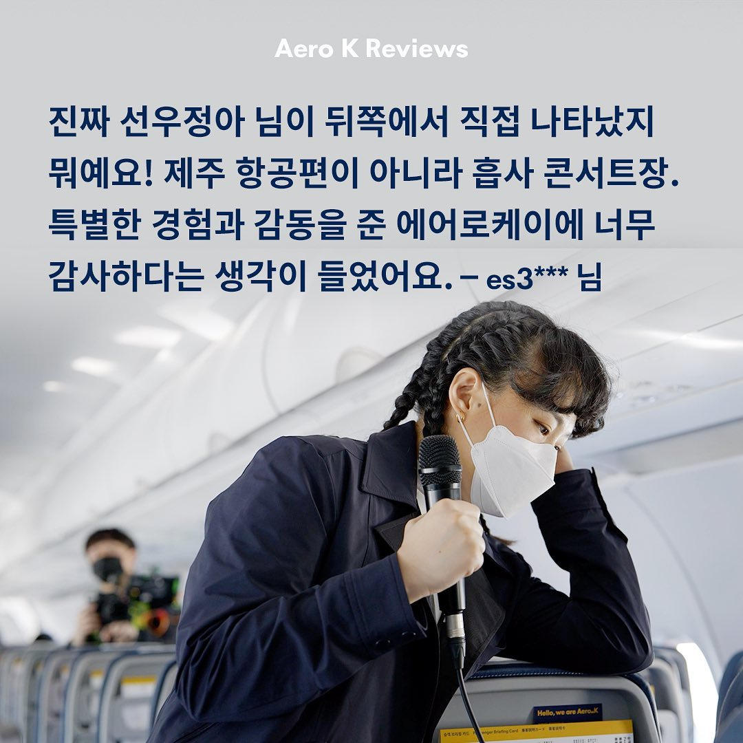 본격적인 정기편 운항을 앞두고 있던 2021년, 에어로케이는 '아티스트 온 보드' 캠페인의 첫번째 주자로 가수 선우정아 씨를 선정하고 직접 큐레이션한 플레이리스트와 기내 방송을 이착륙 시점에 재생했습니다. 하루는 선우정아 씨가 직접 기내에서 게릴라 콘서트를 진행하는 업계 최초의 이벤트를 진행하기도 했고요. 당시는 팬데믹 시기로, 가수는 팬들과의 접점이 부족했고 항공산업 전체의 분위기가 침체되어 있었는데요. 이를 깰 수 있는 새로운 경험을 기획했던 거랍니다. 항공기를 플랫폼으로 고객과 소통한다는 에어로케이만의 항공업 정의와도 맞물리는 시도였고요.