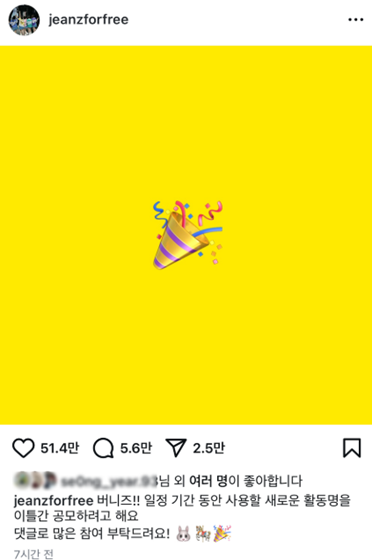 뉴진스 멤버들은 소속사 탈퇴 이후, 'jeanzforfree'라는 인스타그램 계정을 개설했어요. 이 계정은 멤버들이 직접 운영하며, 팬들과의 소통 창구가 되었죠. 전과 달리 자유롭게 자신의 셀카와 엽기 사진을 올리며 대중들에게 이 계정은 큰 인기를 끌었답니다. 그리고 지난 1월 23일, ‘jeanzforfree’ 계정을 통해 뉴진스의 새 활동명을 공모한다는 게시물이 올라왔어요. 이어 멤버들이 댓글로 “좋은 이름 많이 얘기해주시면 저희가 고를 것”이라고 덧붙였어요. 이에 많은 팬들이 게시물 댓글로 활동명을 추천해주었고 공모는 이틀 간 진행되었답니다.