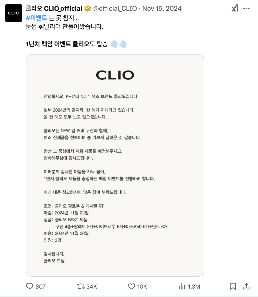 작년 연말, X를 휩쓸었던 이벤트가 있었는데요. 바로 <1년 치 책임 이벤트>입니다. 한 해를 마무리하며 고객들에게 감사 인사를 전하는 편지 형식 글과 함께 함께 추첨을 통해 1년 치 제품을 증정한다는 내용인데요. 해당 이벤트 게시물들은 적게는 수천 회에서 많게는 수만 회 리트윗이 이어졌습니다. 뷰티 브랜드에서 시작한 이벤트가 라이프스타일, 향수 등 국내 브랜드들 사이에서 밈처럼 퍼져나갔죠.