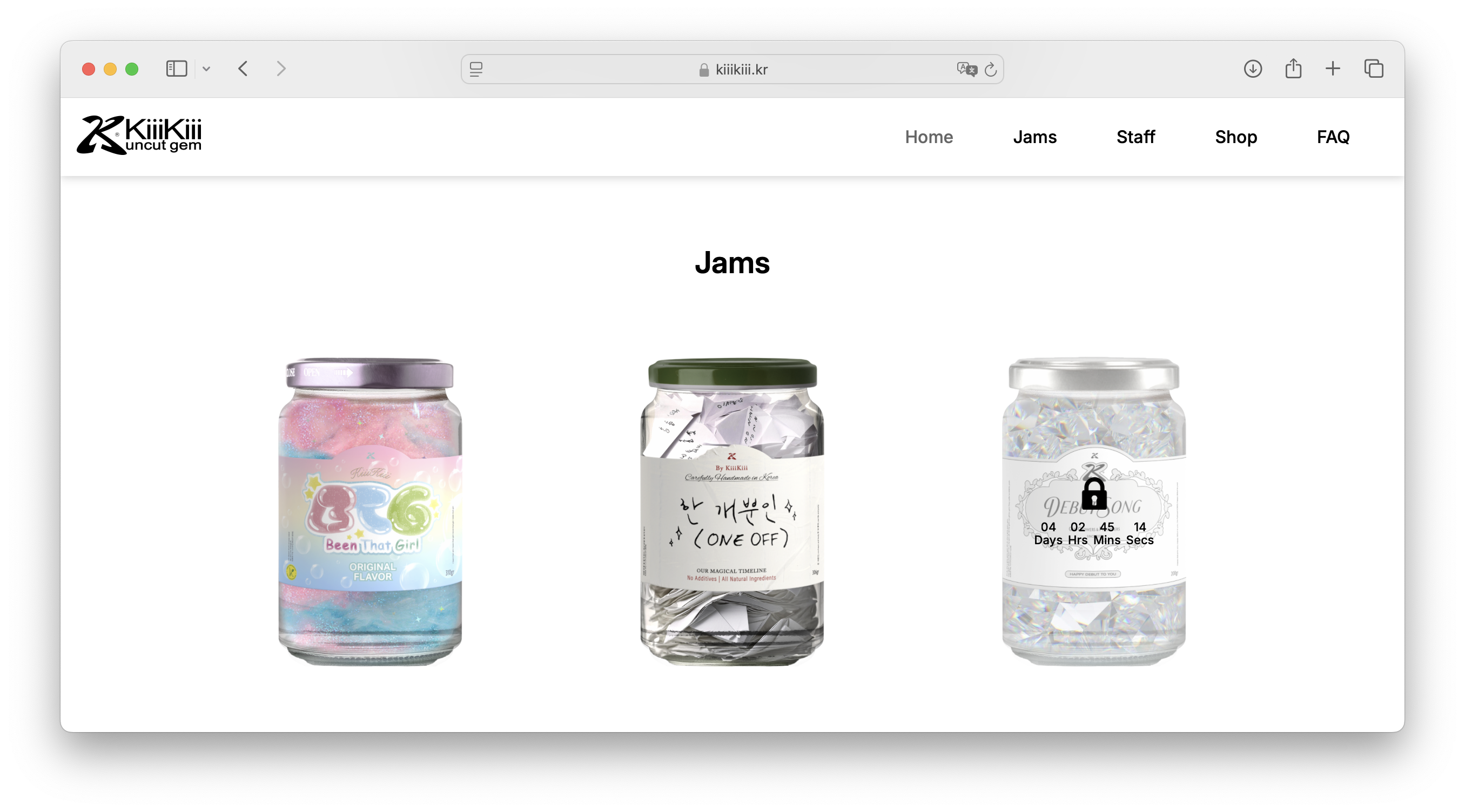 키키는 ‘잼 공장’ 컨셉의 차별화된 홈페이지 프로모션을 진행하고 있는데요. 수록곡 제목이 적힌 잼을 클릭하면 각기 다른 콘텐츠로 연결되어 다양한 체험 거리를 제공하고 있어, “홈페이지 구경만 1시간”라는 반응을 얻고 있습니다.