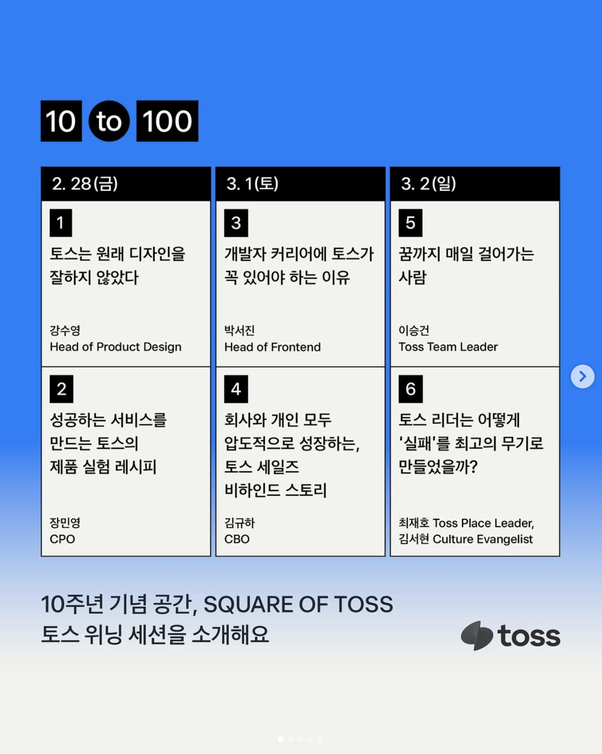 30초 만에 신청 마감 되었다는 후기가 있을 정도로 큰 인기를 얻었던 프로그램, <토크 세션>입니다. 세션은 토스가 10년간 쌓아온 인사이트를 얻을 수 있는 '토스 위닝 세션'과 금융부터 인생설계에 도움을 주는 '넥스트 토크 세션' 구성되어 있죠.