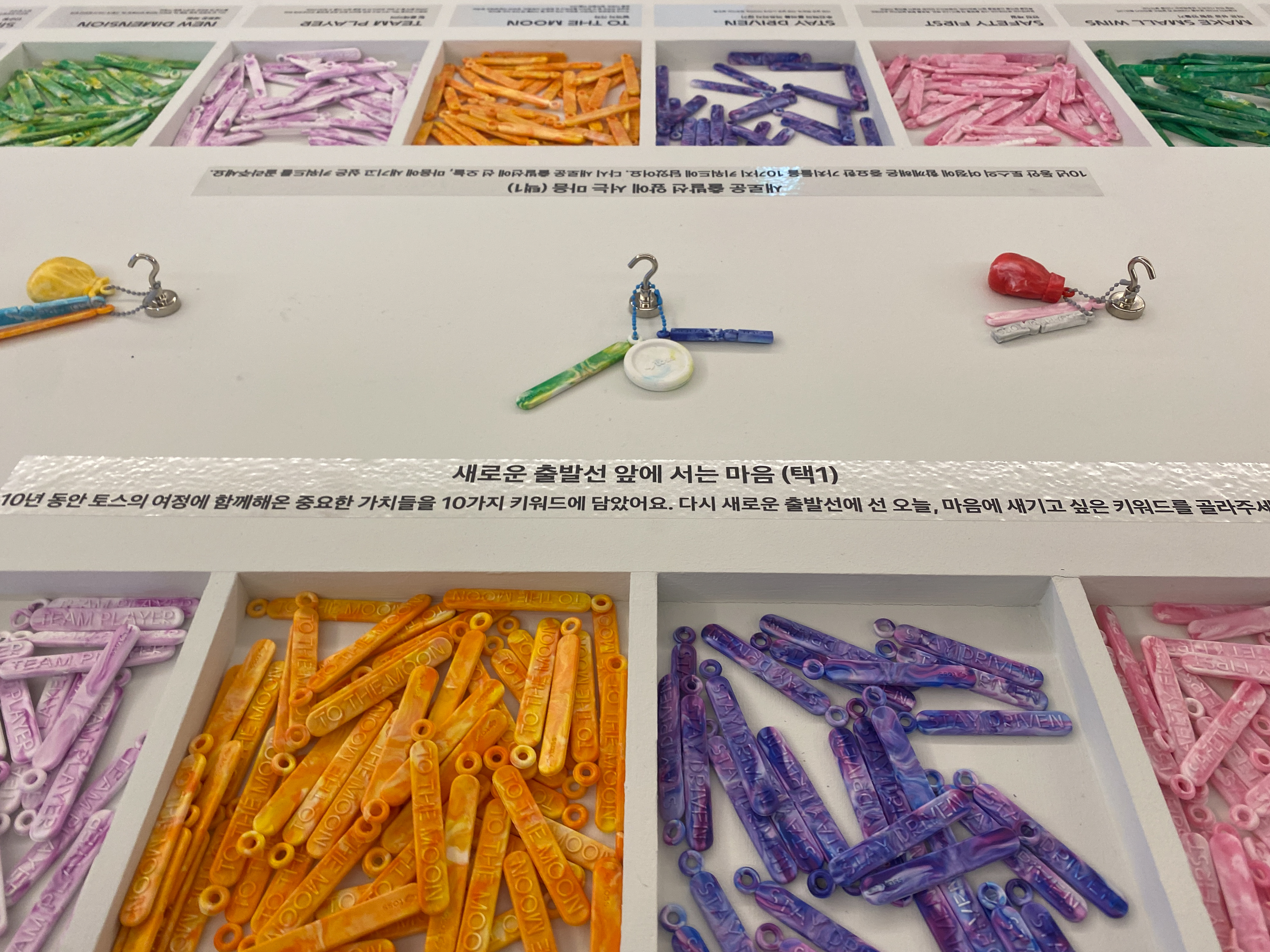 <키링 워크숍>은 앞서 알아본 개인의 금융 성향과 토스의 10가지 가치를 조합해 나만의 키링을 만드는 공간입니다. 요즘 굿즈 트렌드를 반영한 리싸이클링 NFC 키링이었죠. 여기서 인상적이었던건 키링을 태그 하면 토스 피드 콘텐츠 중 내 성향에 맞는 콘텐츠로 연결해 주는 점이었습니다. 팝업인 오프라인에서 토스의 온라인 서비스로 고객과의 관계가 이어질 수 있도록 적재적소에 잘 활용했다 느껴졌거든요.