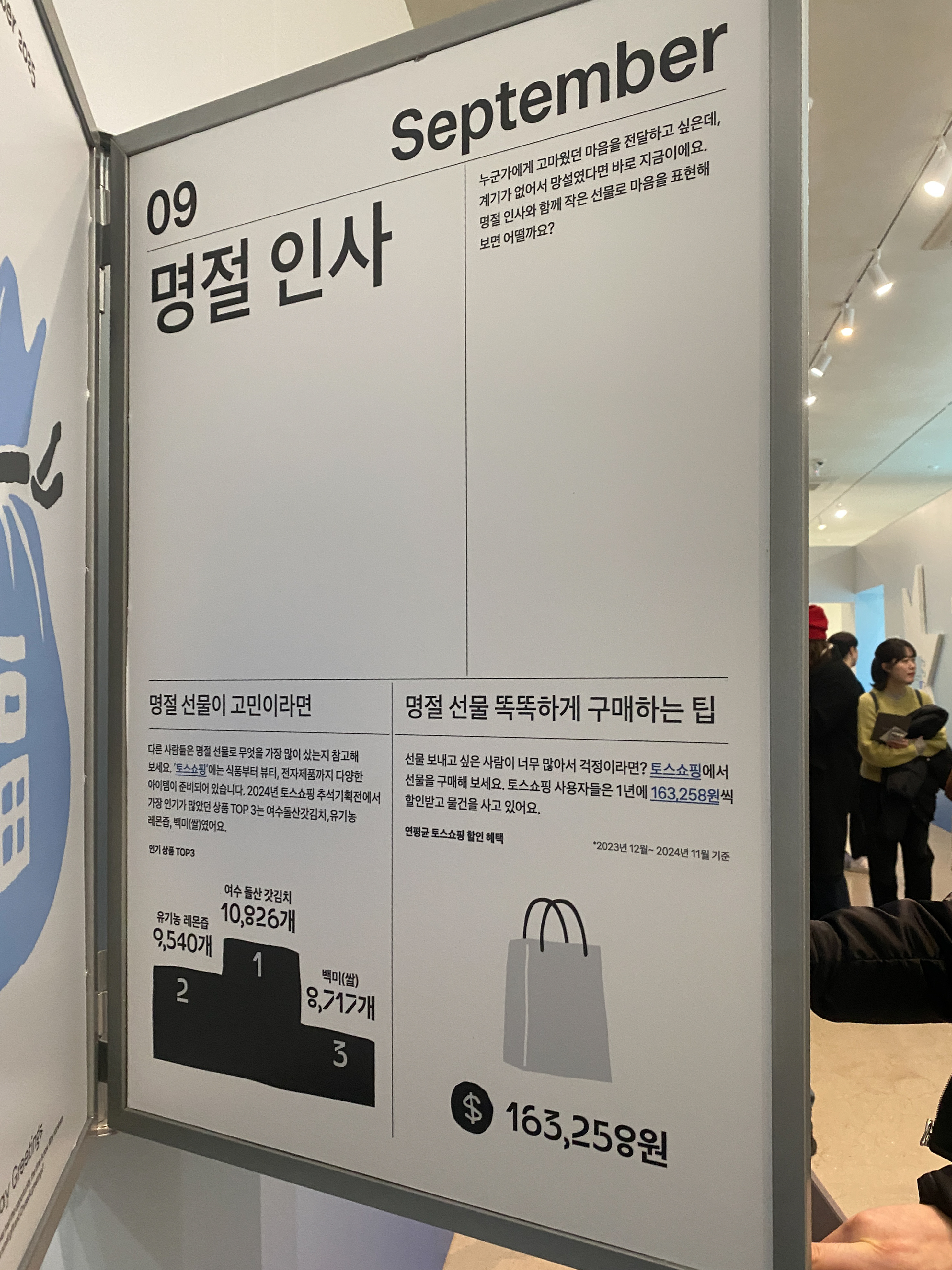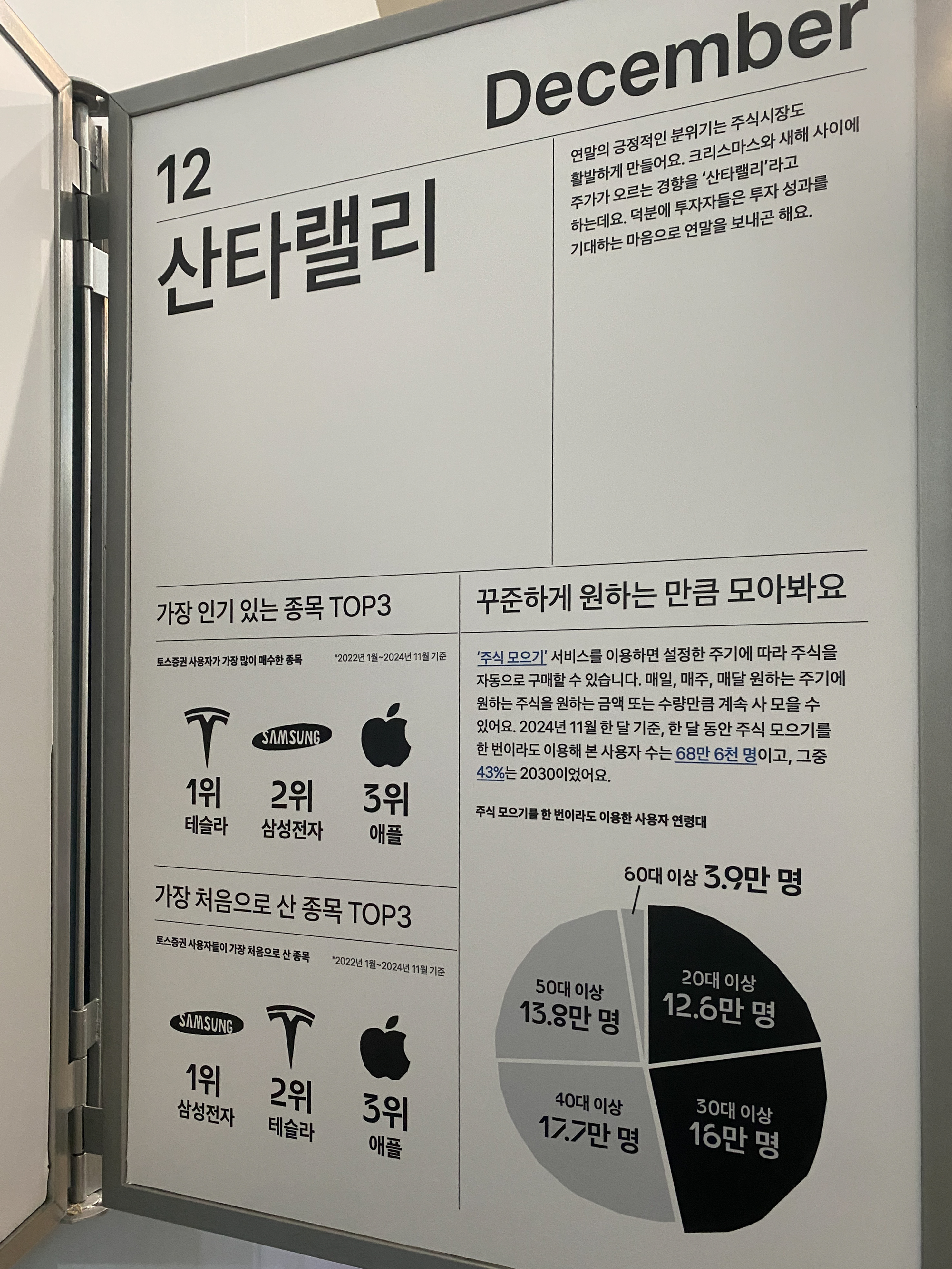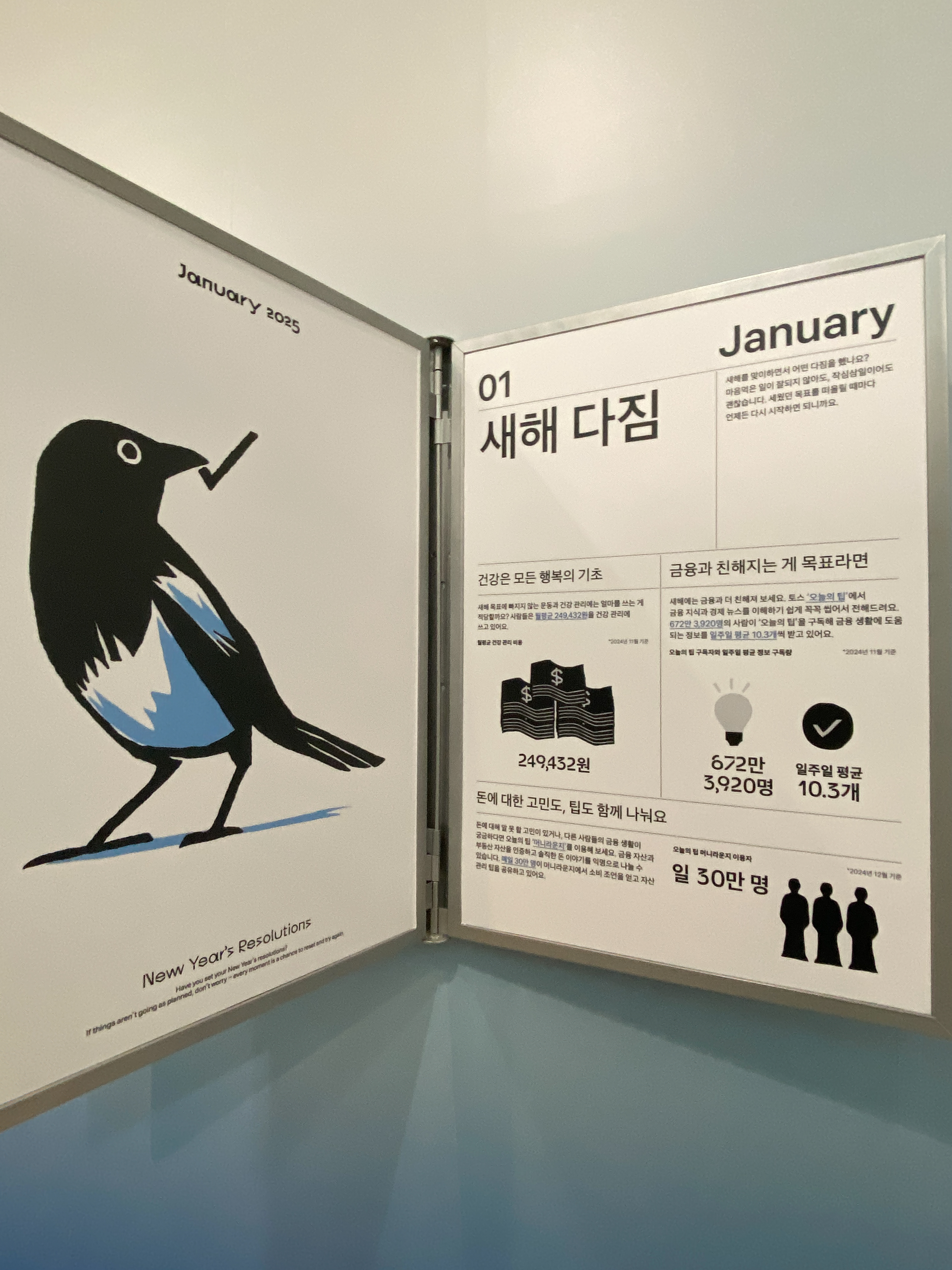 맞은편은 귀여운 일러스트와 더불어 월 별 금융 생활을 살펴 볼 수 있는 '달마다, 금융'입니다. 도식화된 데이터를 통해 사람들의 금융 생활 정보를 직관적으로 전달했죠. 인상적이었던 점은 각 월 별로 고객이 공감할 수 있는 컨셉에 토스의 서비스를 연결했다는 것인데요.
