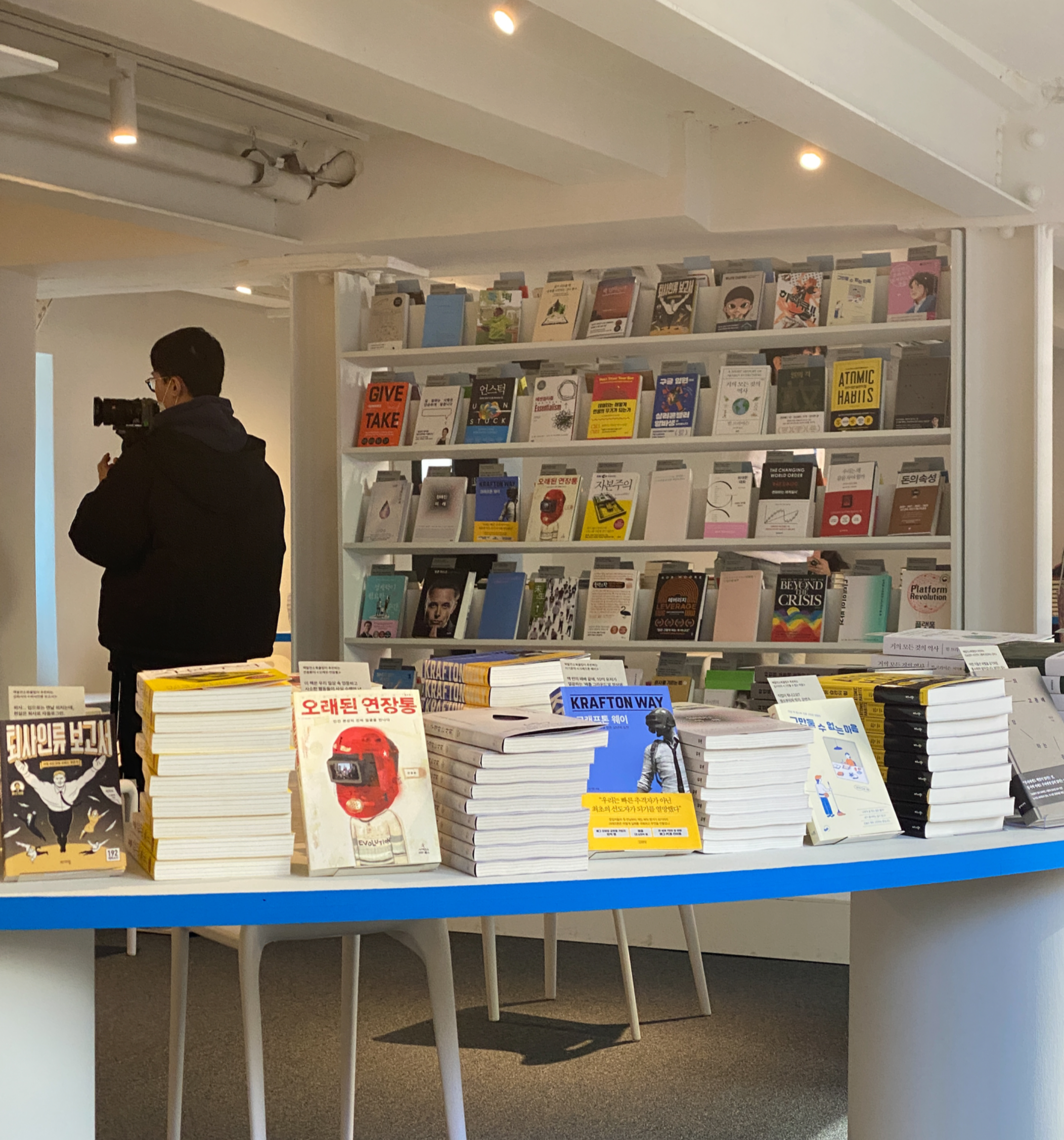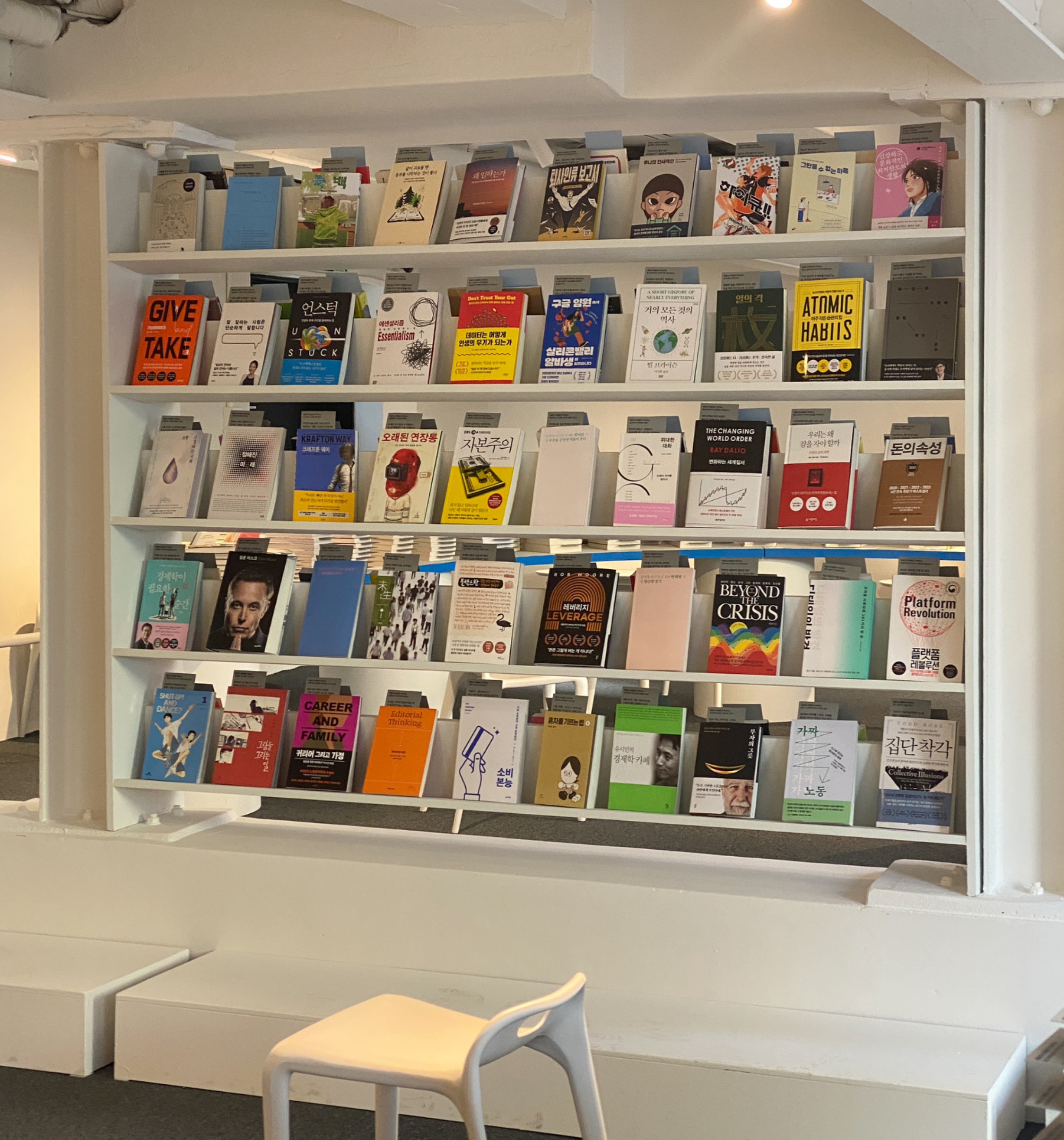 <라이브러리>는 북카페 분위기의 공간으로 누구나 책을 읽을 수 있는 공간인데요. 팝업의 주제인 '새로운 출발'에 도움이 되는 100권의 책이 큐레이션 되어 있죠. 돈 관리법에 관한 책부터 일을 소중히 대하는 태도와 실천력에 관한 책까지 종류가 다양했습니다. 책마다 짧은 소개가 곁들여져 있어, 어떤 내용인지도 쉽게 알 수 있었죠.