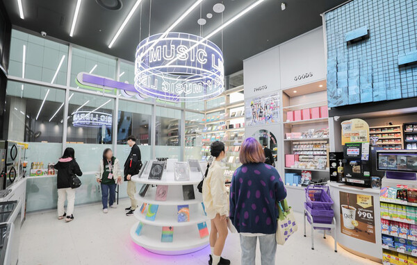 CU는 엔터테인먼트 특화 편의점인 뮤직 라이브러리 컨셉의 'CU 에이케이 & 홍대점'을 선보였습니다. 이곳은 K-POP 팬들을 위한 공간으로, 대형 키네틱 사이니지를 통해 실시간으로 아이돌 뮤직비디오를 상영합니다. 벽면에는 200여 개의 K-POP 앨범과 한정판 굿즈가 전시되어 있는데요. 외국인 관광객이 많이 방문하는 상권의 특징을 살려 구매를 손쉽게 하기 위한 사이니지도 특징입니다.