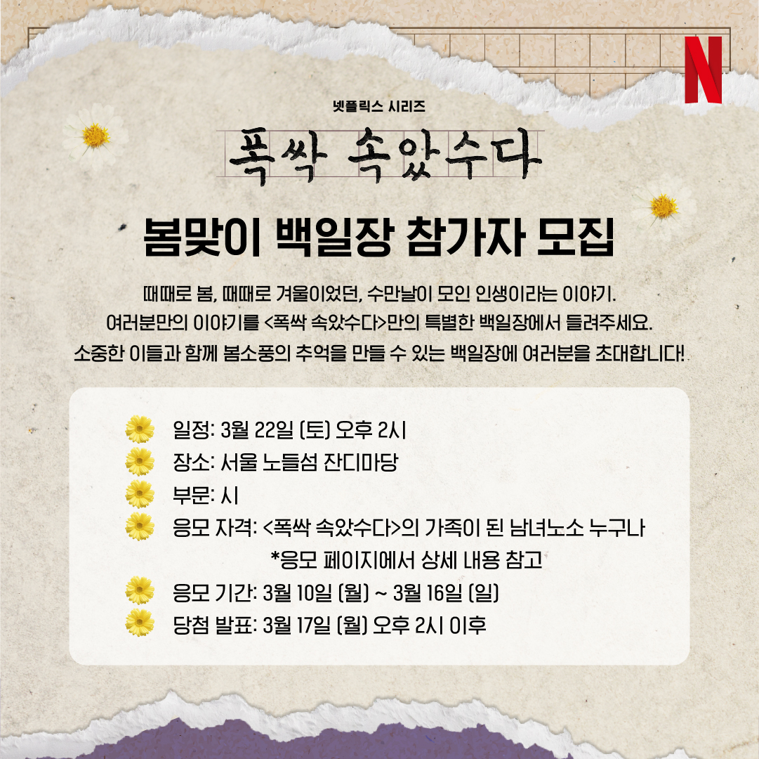 지난달, 넷플릭스는 드라마를 직접 경험을 할 수 있는 특별한 온•오프라인 이벤트를 진행했습니다. 극 중 문학을 사랑했던 여주인공 애순처럼, 시청자들도 자신들의 인생 이야기를 문학 작품으로 남기는 이벤트를 기획한 것인데요. 온라인에선 5줄 이하의 수필을, 오프라인에선 시 부문으로 백일장을 진행했죠.