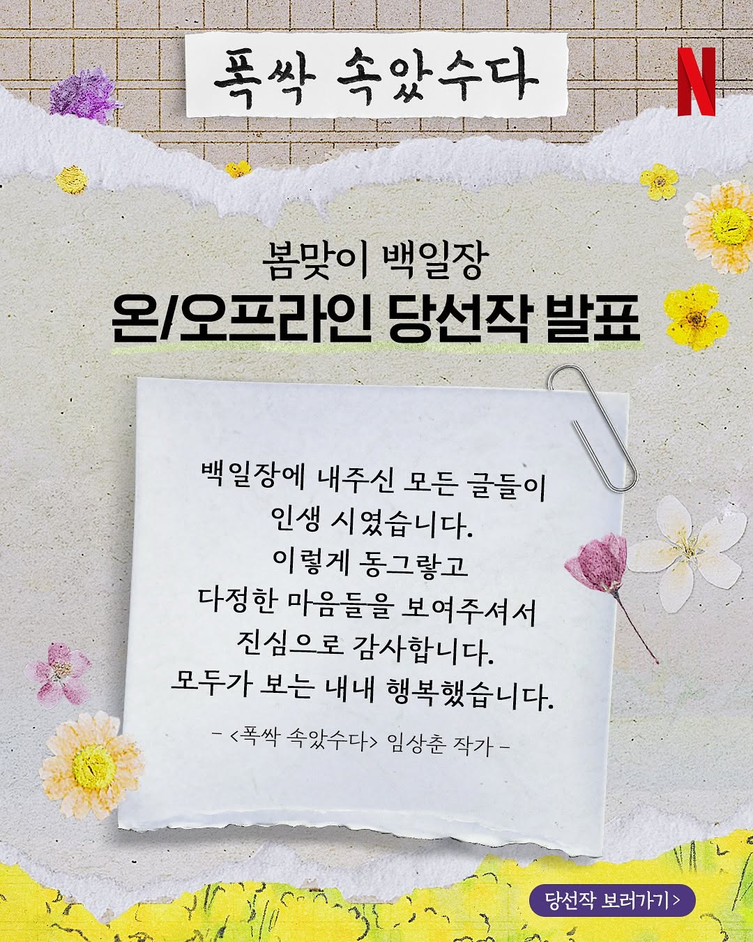 이후 넷플릭스는 드라마의 작가인 임상춘 작가님의 짧은 심사평과 함께 선정된 작품을 공개했는데요. 공개 직후 '눈물이 난다' '역대 행사 중 최고다'라는 긍정적인 반응이 쏟아졌죠. 이 시대의 애순이 들려주는 감동적인 작품과 심사평 덕분에 드라마의 감동을 배로 느낄 수 있었던 완벽한 피날레였습니다.