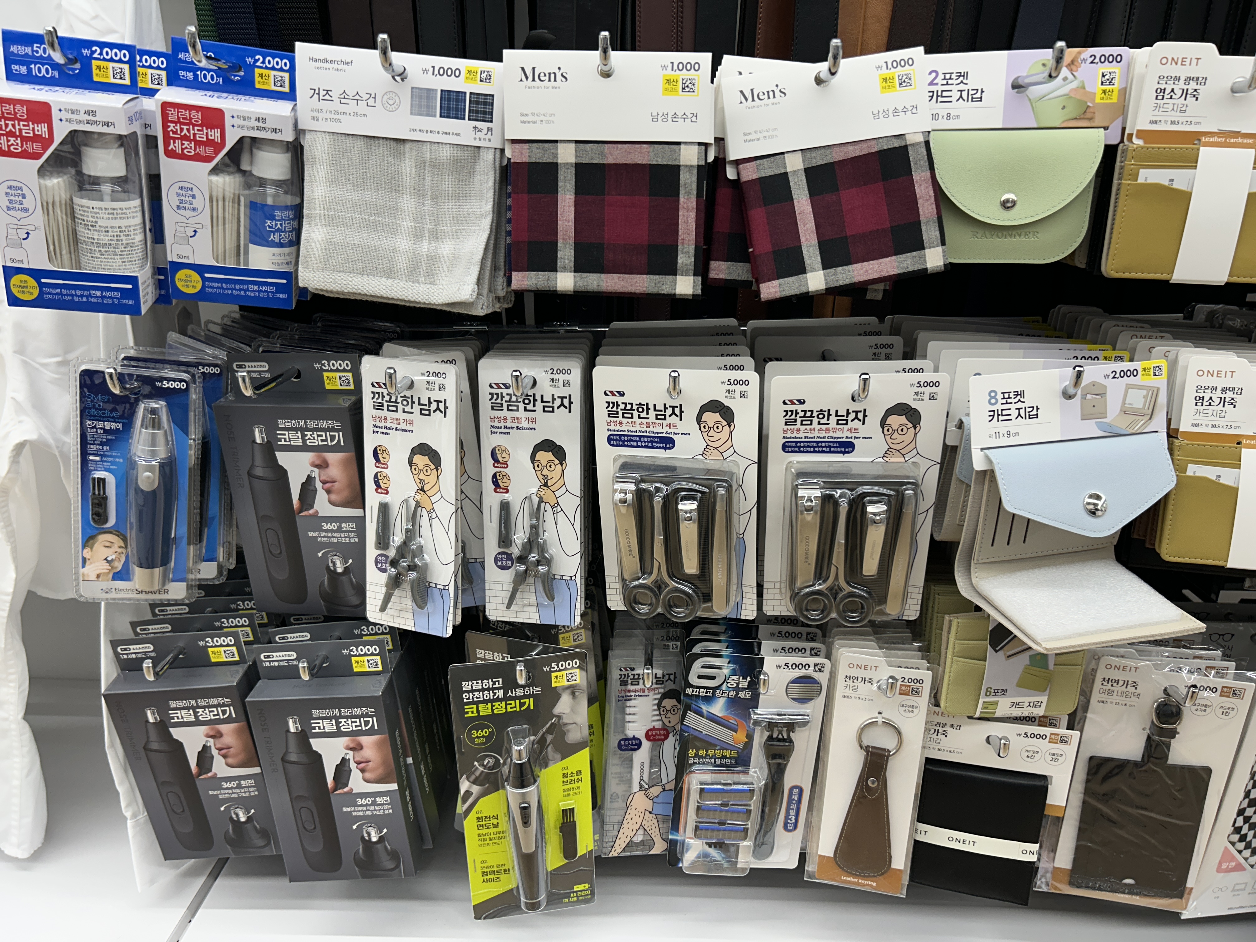 진열방법도 달라졌습니다. 여기는 남성 패션용품칸. 와이셔츠와 넥타이, 벨트 등 정장 관련 아이템 아래. 코털정리기, 전자담배 세정기가 놓였습니다. 실제 직장인 남성들이 자주 찾을 법한 물건들이죠. 상품의 속성을 따르는 전통적인 진열이 아니라, 우리 생활에 더욱 닿아있는 맥락이 담긴 진열입니다.