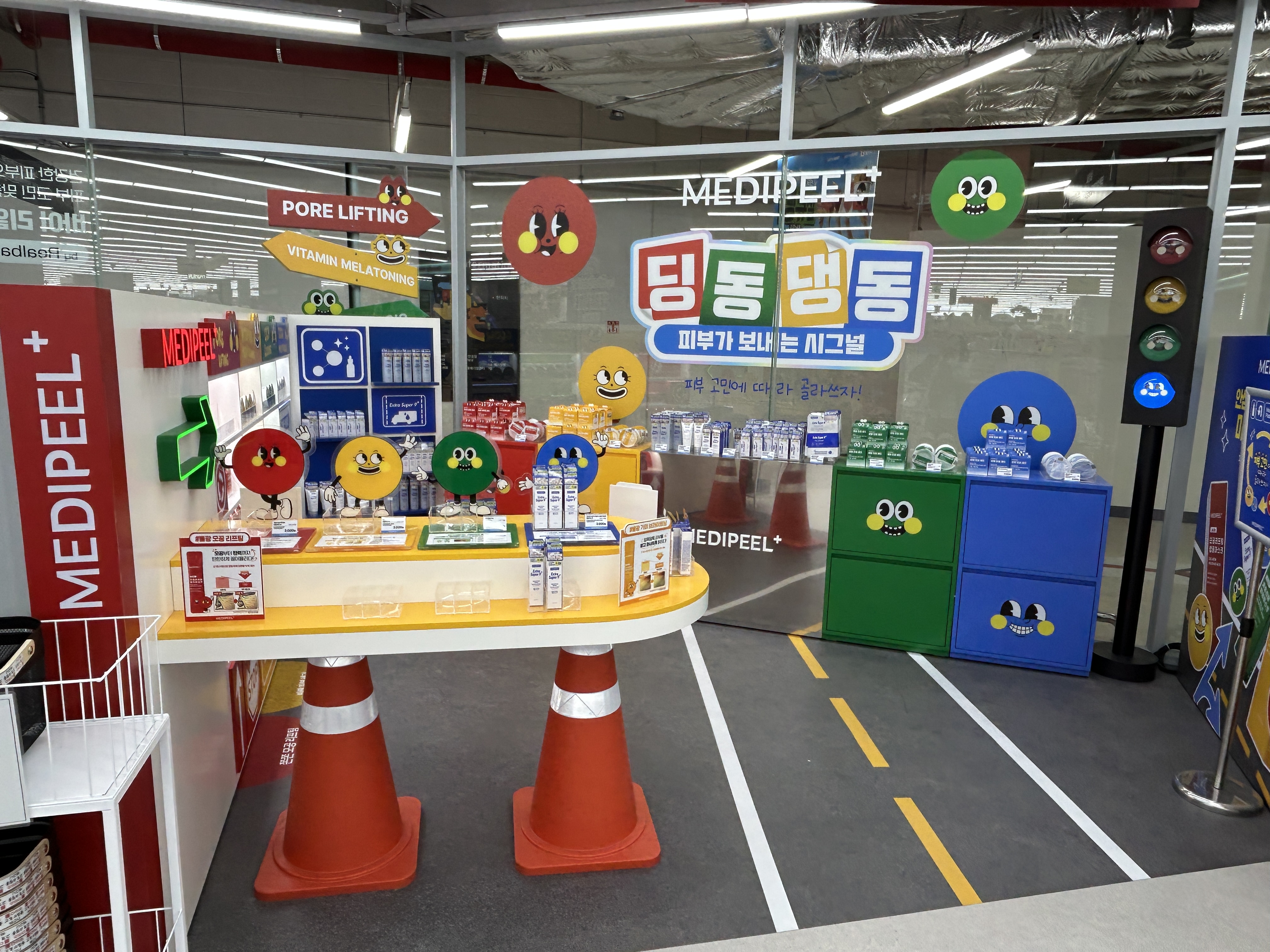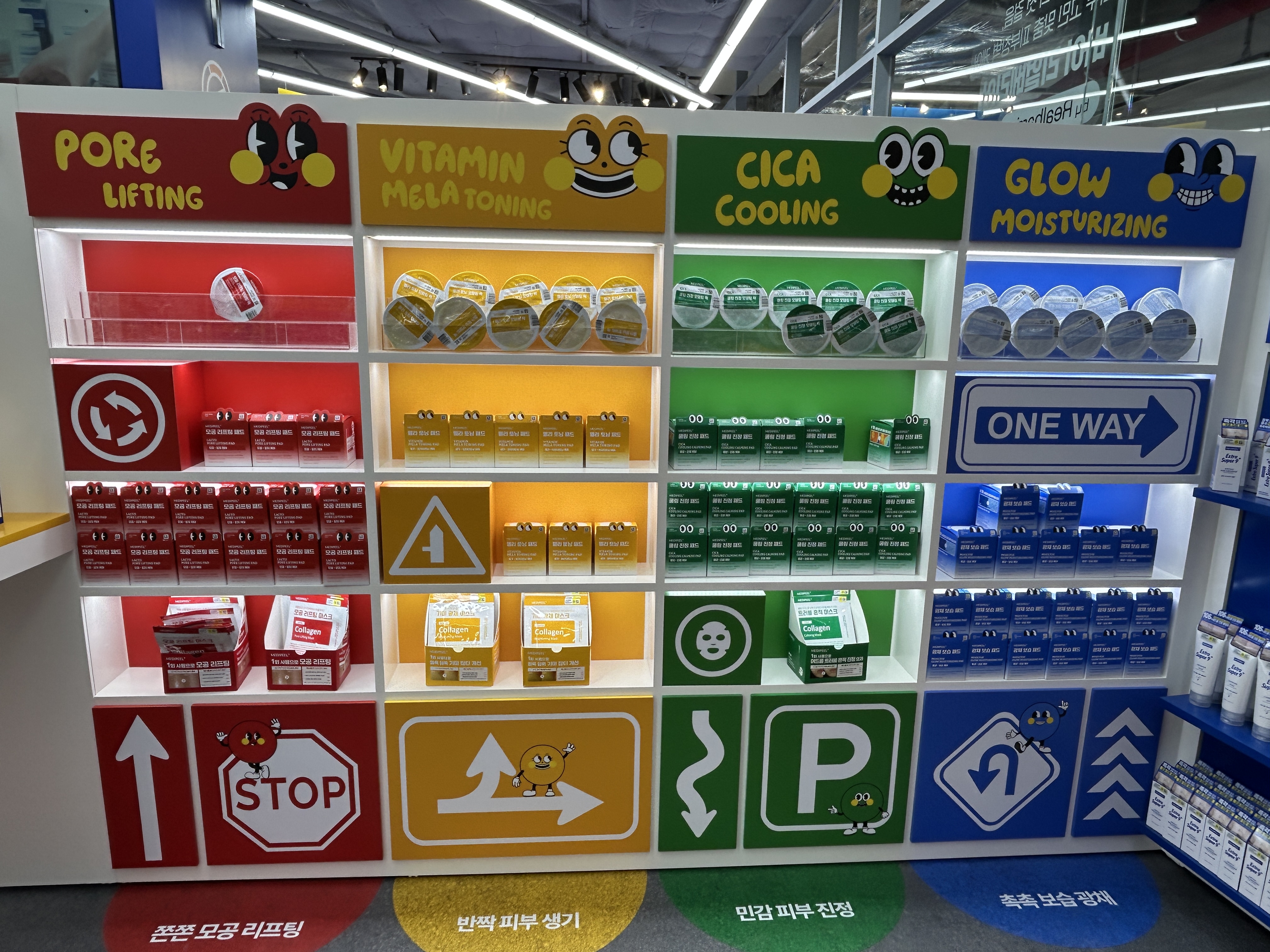 입구에 들어서자 뷰티 브랜드의 테마존이 가장 먼저 눈에 띕니다. 화려한 대형 사이니지와 체험존으로 강한 존재감을 보여주는 이곳! ‘플레이 101 바이 에뛰드’, ‘트윙클팝 바이 클리오’ 등 유명 뷰티 브랜드에서 Z세대 타겟으로 만든 서브 브랜드가 그 주인공입니다. 5천 원 미만 부담 없는 가격으로 아이라이너, 립, 블러셔 등 메이크업 제품을 직접 발라 보고 체험할 수 있어요.