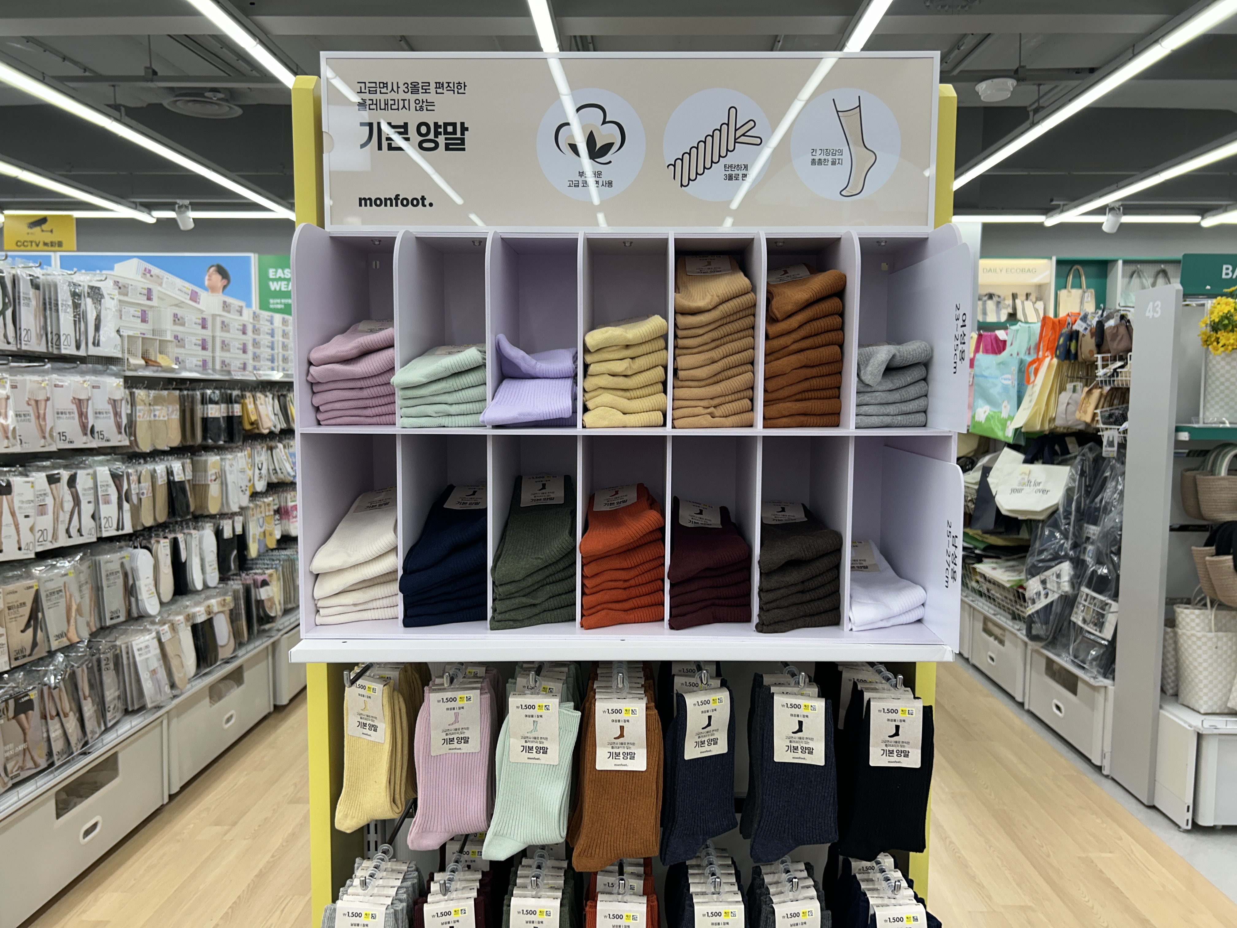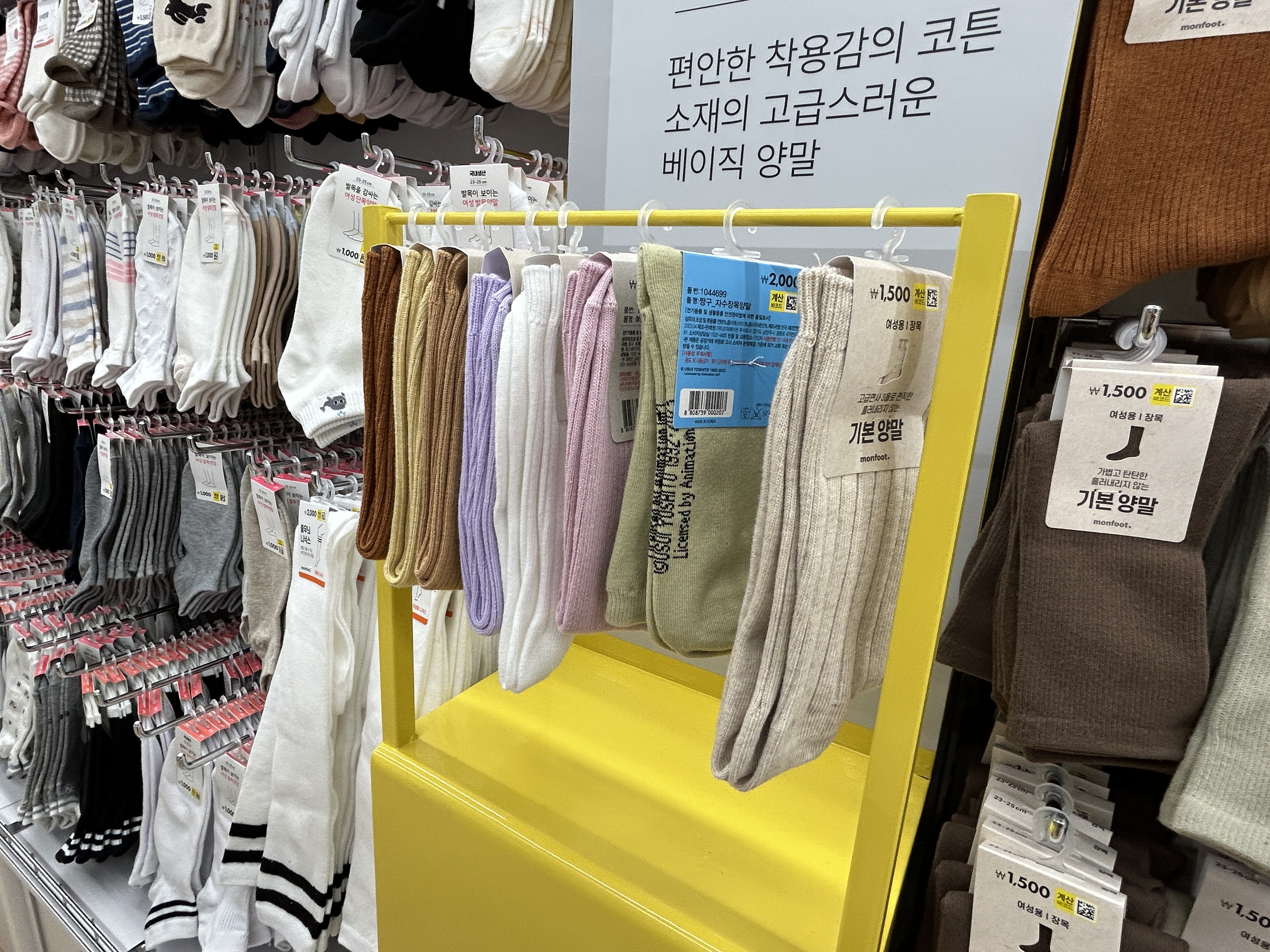 패션 코너에서는 SPA 의류 브랜드를 방불케하는 모습이 보였습니다. 쿨링 효과를 가진 기능성 티셔츠부터, 이너웨어와 스포츠 레깅스, 심지어 맨투맨까지 있고요. 대표적으로 양말 코너에서는 30종이 훌쩍 넘는 색색깔 양말의 향연이 펼쳐졌습니다. '양말' 단일품목으로 이토록 방대한 다양성을 갖춘 다이소의 저력이라니. 새삼 놀라는 순간이었어요.