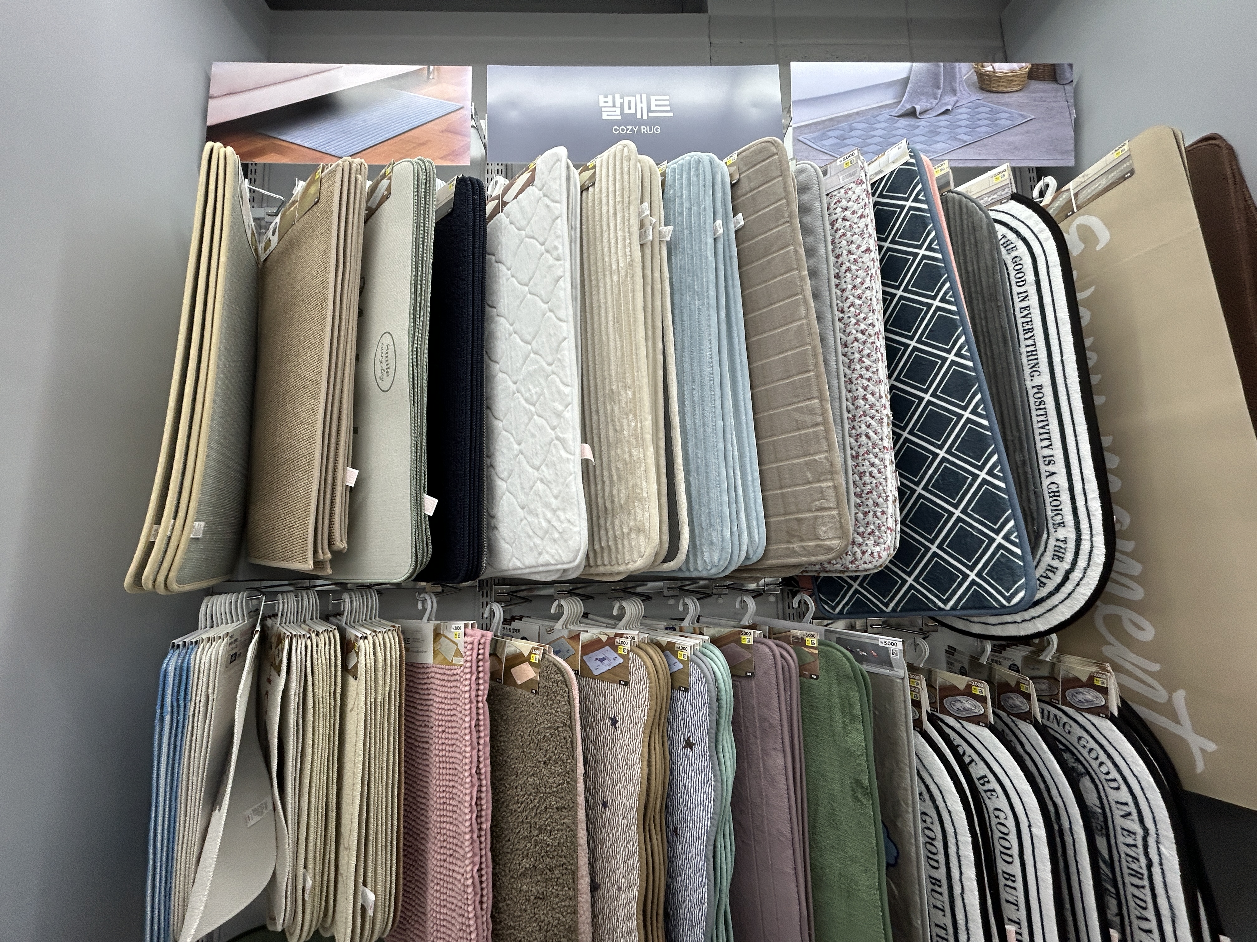 여기에 더해, 쇼핑이 더 편해지는 가이드도 제안합니다. 인테리어 코너였는데요. 30여 종 발매트 중에서 뭘 골라야 할지 난감하던 차에 우연히 발아래를 보고 깜짝 놀랐습니다. 실제 사이즈별로 발매트가 프린팅 된 시트지가 붙어 있었기 때문입니다. 눈으로만 보면 크기를 가늠하기 어려울 수 있는데, 이렇게 그림 위에 직접 밟아보고 사면 아무래도 실패할 위험이 대폭 줄어들겠죠. 사소해 보여도 고객의 애로사항을 세심하게 알아주는 디테일입니다.