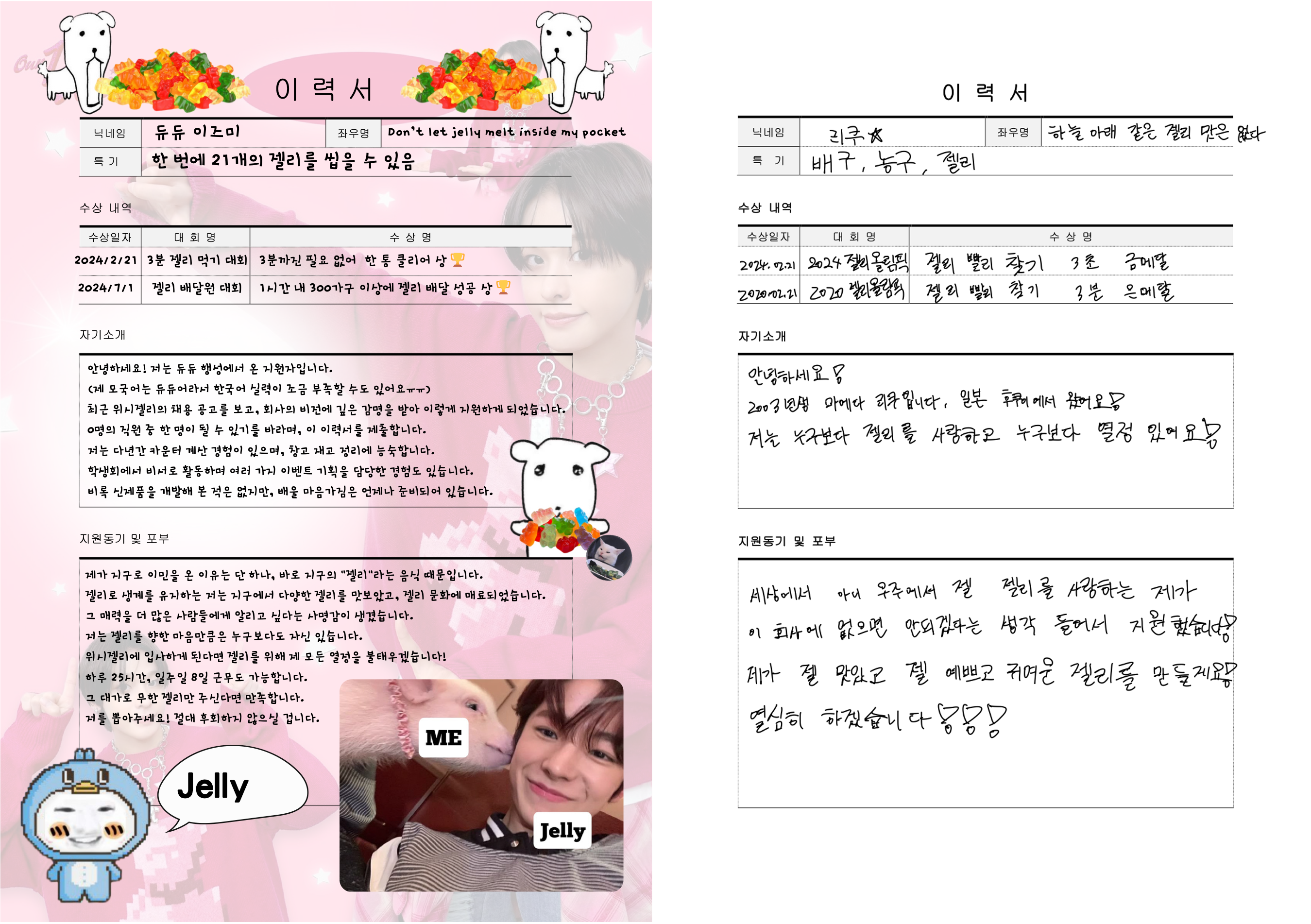 위시젤리 기업에 입사하기 위해 해야 할 일 첫 번째는 바로 이력서 작성이겠죠? 구글 드라이브를 통해 이력서 양식을 공유하고, 팬들이 직접 작성할 수 있도록 했습니다. 멤버들이 실제로 작성한 합격 이력서와 합격자 명단도 공개했는데요~ 시온을 제외한 멤버 5명만 합격했습니다(?). (그 이유는 뒤에서 확인해 보세요!)