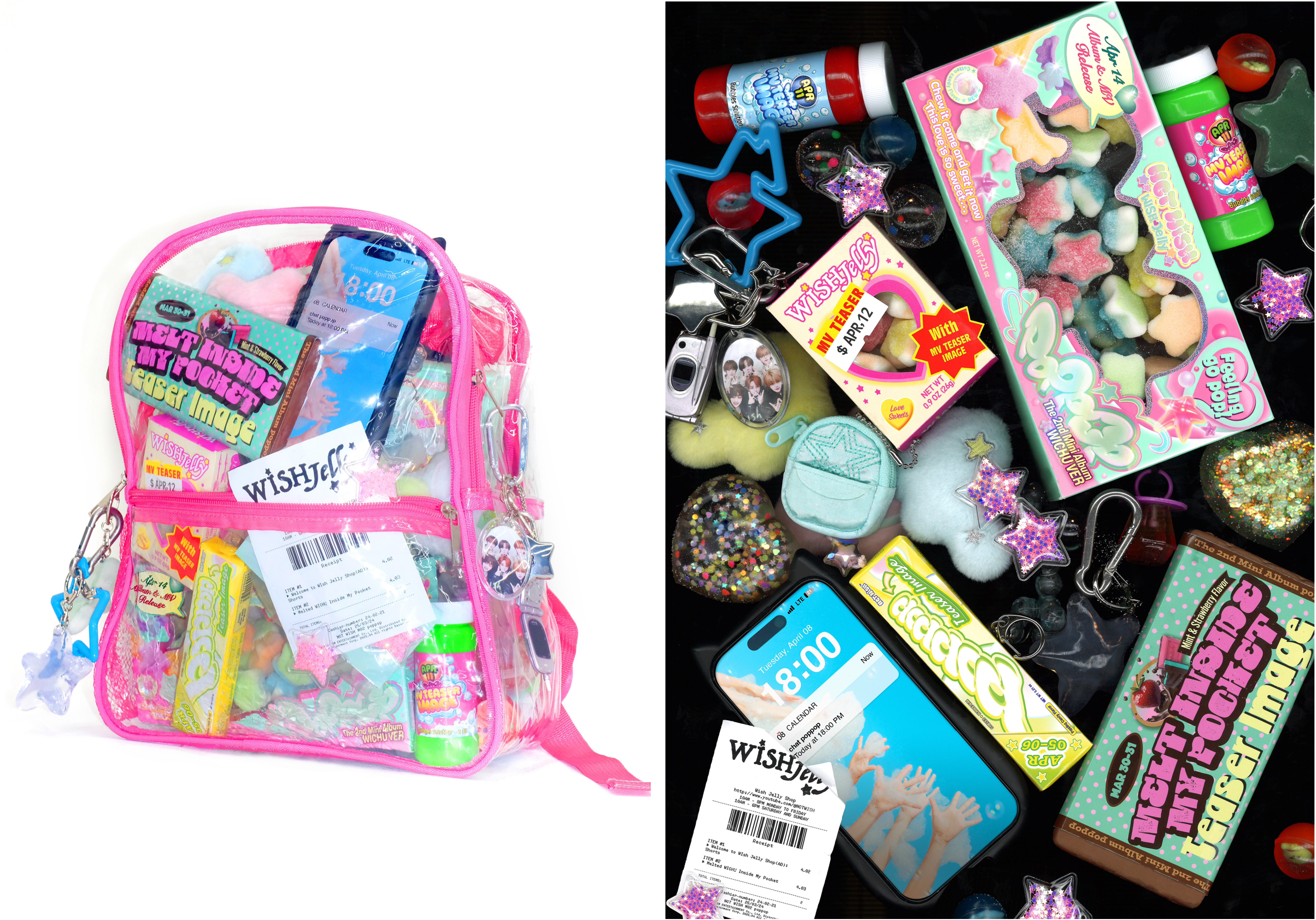 지난번 소개한 엔시티 마크의 프로모션에서는 티셔츠에 타임테이블 요소를 합쳐 제작했는데요. 엔시티 위시도 마크만큼 독특한 방법으로 타임테이블을 공개했습니다. 바로 투명 가방 속 왓츠인마이백 콘셉트!