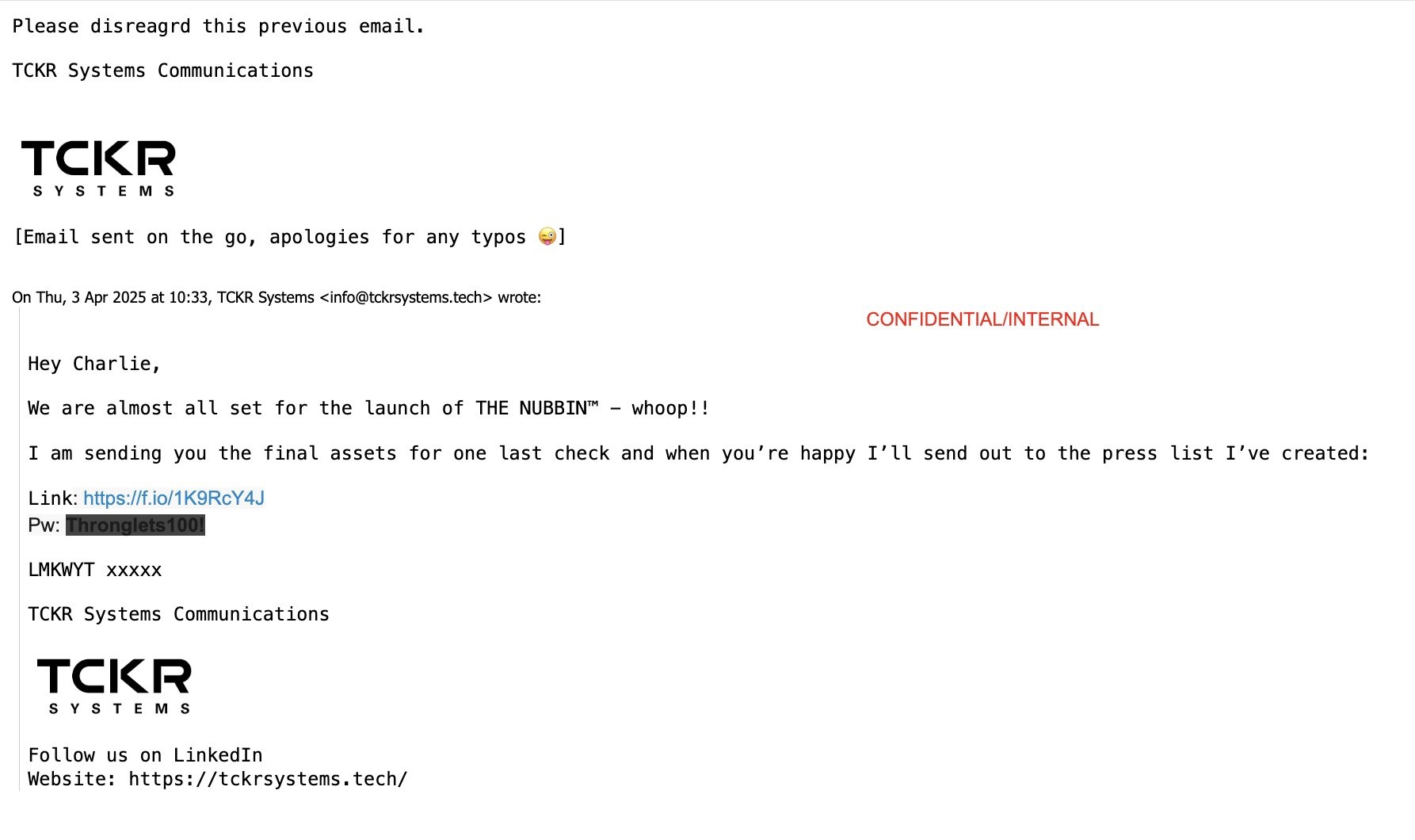 상황은 꽤나 급박하게 시작됐습니다. ‘TCKR 시스템즈 커뮤니케이션’에서 보낸 '기밀' 이메일이 블랙 미러 제작자 찰리 브루커에게 도착했죠. '너빈'이라는 신제품 출시가 준비됐다는 내용이었습니다. 외신 할리우드 리포터를 비롯해서 코스모 폴리탄 등 여러 언론사에 발송됐죠. 그리고 그 직후 ‘앞선 이메일은 무시해 주세요’ 이메일이 또 도착했습니다. 진짜 직원이 실수한 것처럼요. 메일 내용은 아래 이미지에서 확인하실 수 있어요.