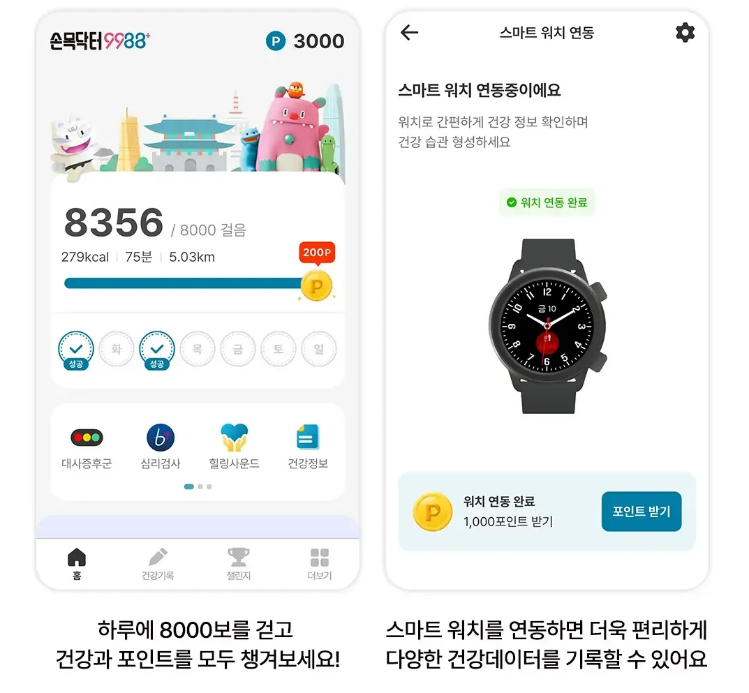 서울시에서 운영하는 헬스케어 프로그램, 손목닥터 9988+. 누적 참가자는 200만 명, 서울 시민 5명 중 1명 꼴로 사용할 만큼 인기가 좋습니다. 하루 8,000보 이상 걸으면 200포인트가 적립되고, 포인트는 서울페이로 전환해 현금처럼 쓸 수 있어요. 음식점, 편의점 등 일상생활에서 사용할 수 있어 유용하죠. 초기에는 시민들에게 스마트 워치를 무료로 대여해 주면서 사용자를 대규모로 끌어모았고요.