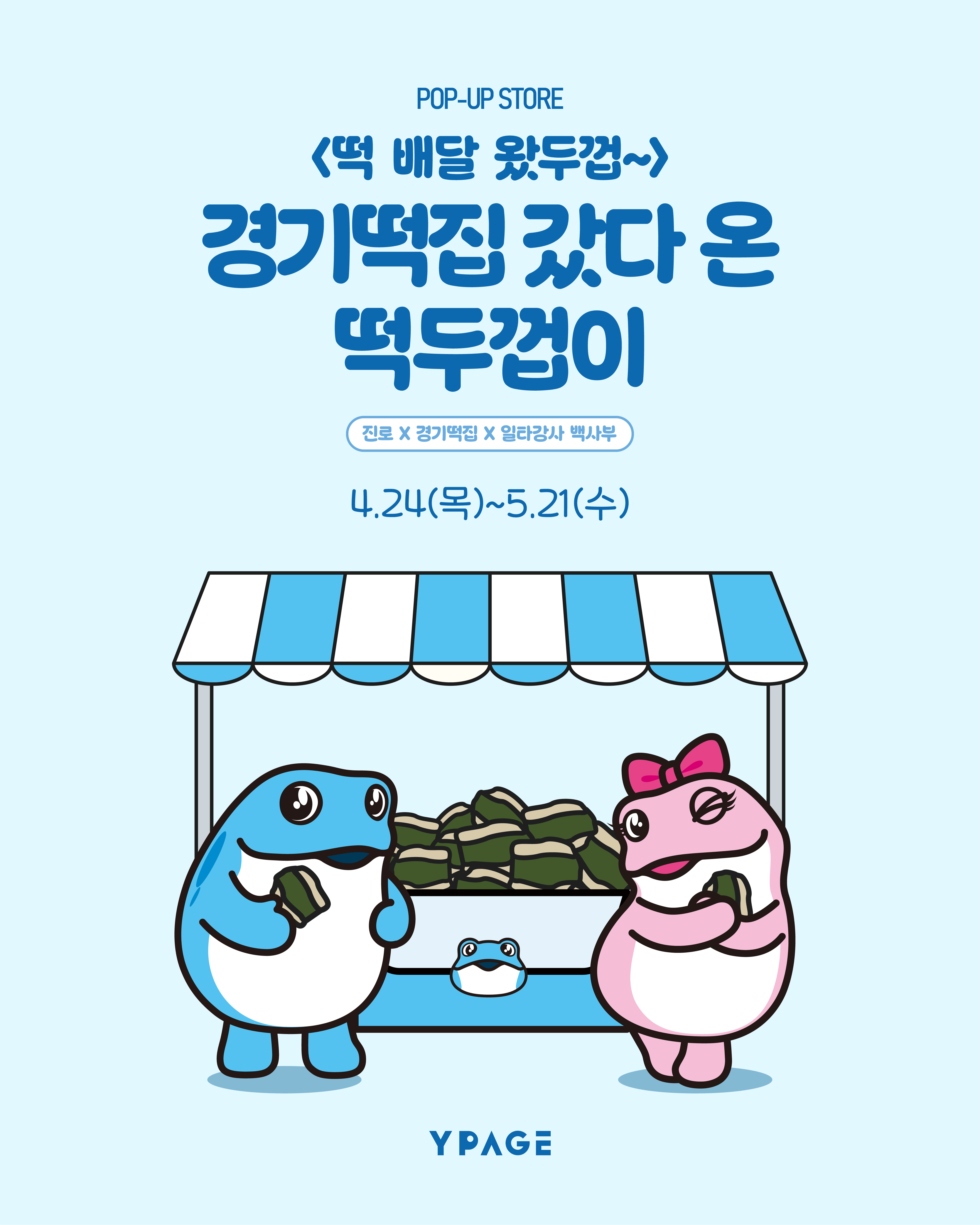 진로의 귀여운 두껍이가 떡을 메고, 떡두껍이로 변신해 경기떡집과 함께 찾아왔어요. 서울 3대 떡집 중 하나인 경기떡집의 인기 메뉴인 이티떡과 웹툰 일타강사 백사부가 합세한 완벽한 콜라보!