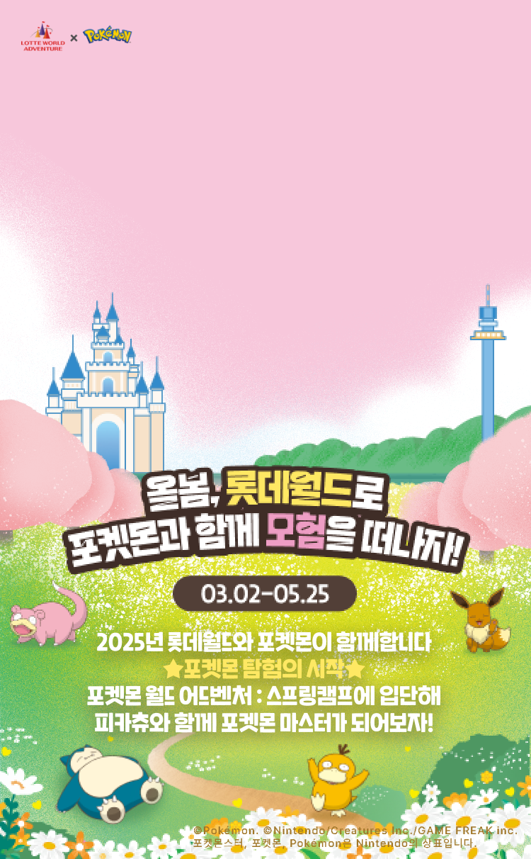 3월부터 시작한 롯데월드 x 포켓몬 행사가 이번달까지만 진행돼요. ‘포켓몬 월드 어드벤처: 스프링캠프’는 포켓몬 마스터의 여정을 테마로, 매직캐슬과 어트랙션 곳곳에서 펼쳐지는 탐험과 체험이 가득합니다.