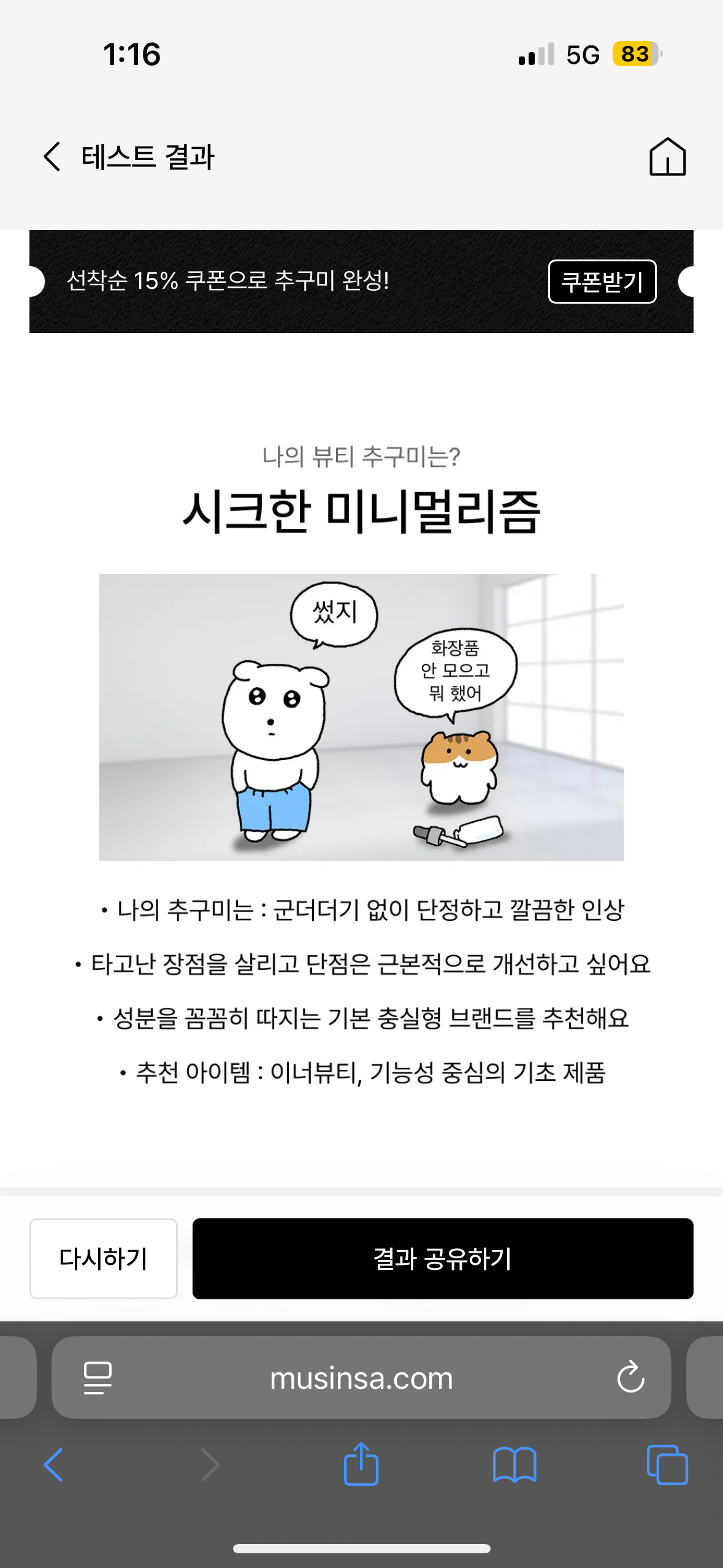 플로위는 인스타그램 스토리를 올리면 앰플 제품을 제공하는 이벤트를 하고 있었어요. 에디터가 받은 이 제품, 정말로 효과가 좋았습니다. 원래는 30살인데 29살로 보인다고 하네요. 이렇게 도장 네 개를 다 찍었더니 제 뷰티 추구미가 '시크한 미니멀리즘'으로 정리됐습니다. MBTI보다 정확한 것 같은데요?