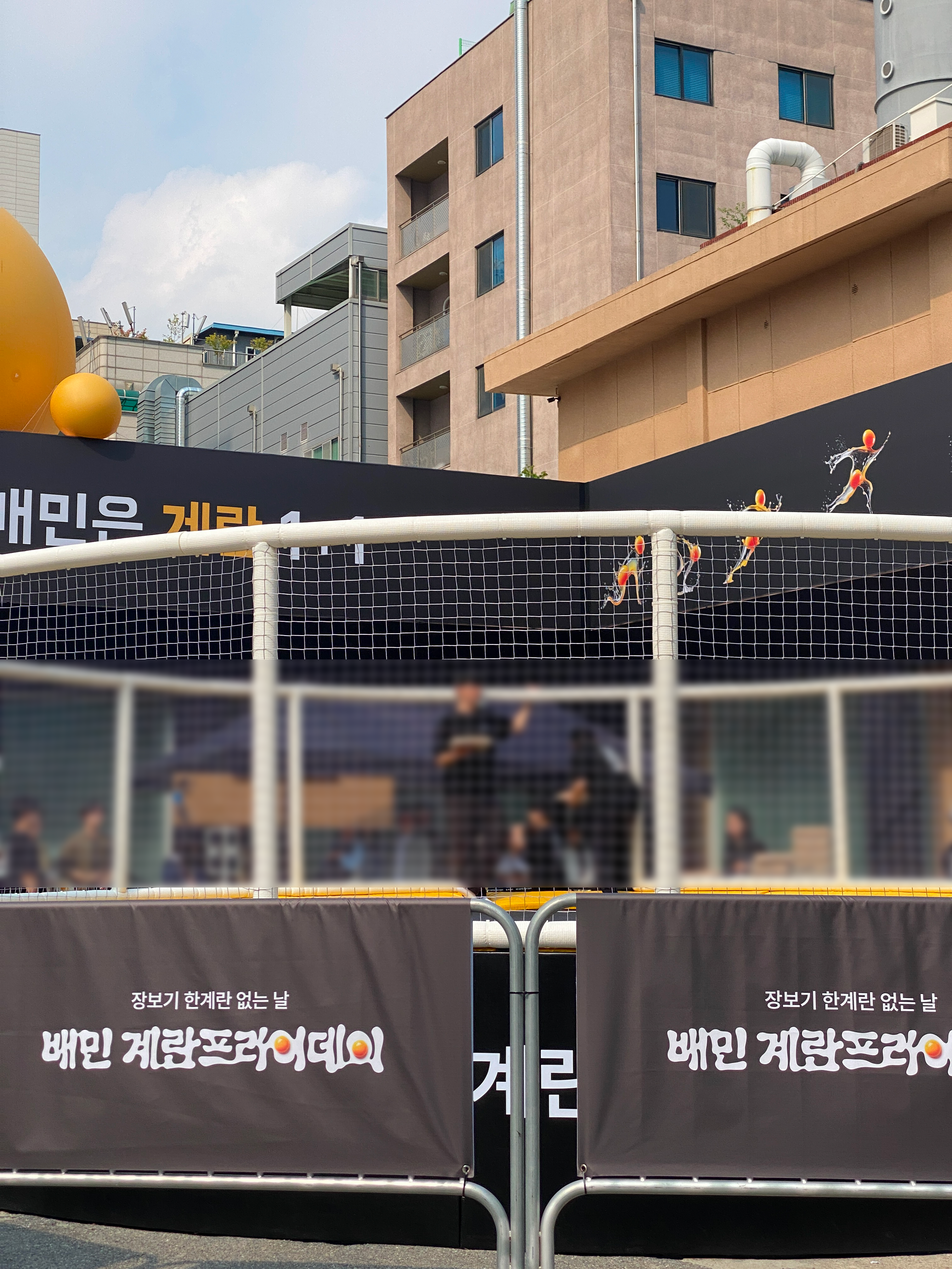 성수동 핫플 거리에 들어서자마자 단연 눈에 띄는 건 거대 노른자였습니다. 날계란으로 도배된 건물 외벽 그리고 거대 트램펄린까지. 배민은 이렇게 규모감 있는 외관으로 시작부터 많은 사람들의 이목을 끌었습니다. 날계란을 사람으로 형상화한 배민다운 참신한 크리에이티브는 근처를 오가는 사람들의 시선을 1차로 사로잡았고, 거대 트램펄린 게임은 2차로 흥미를 자극했죠.
