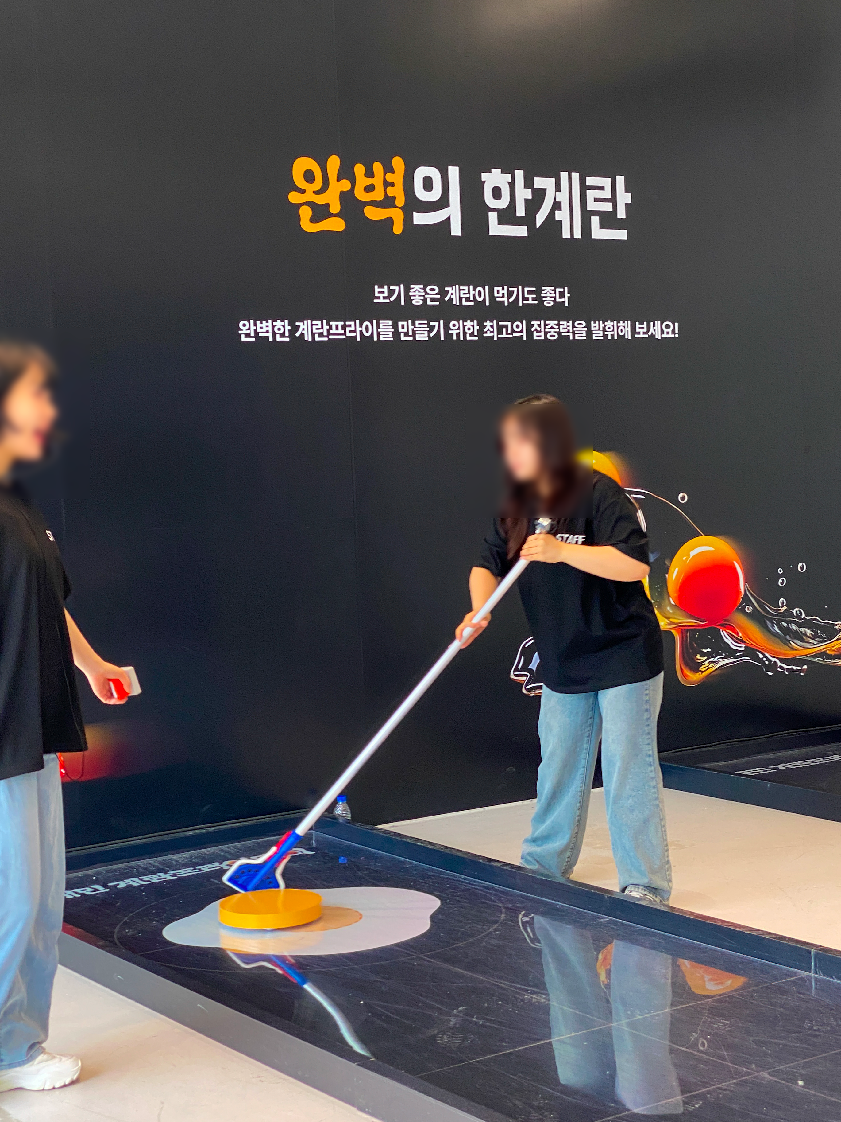 팝업에서 가장 처음 만난 콘텐츠는 바로 게임존이었는데요. 게임은 총 3가지로 구성되어 있었습니다. 외부에 설치된 트램펄린 게임, 순간적으로 떨어지는 바통을 잡는 바통 게임, 그리고 노른자를 밀어 계란프라이를 만드는 컬링 게임까지! 얼핏 보면 계란과 그다지 관계없는 거 아닌가? 싶기도 했는데요.