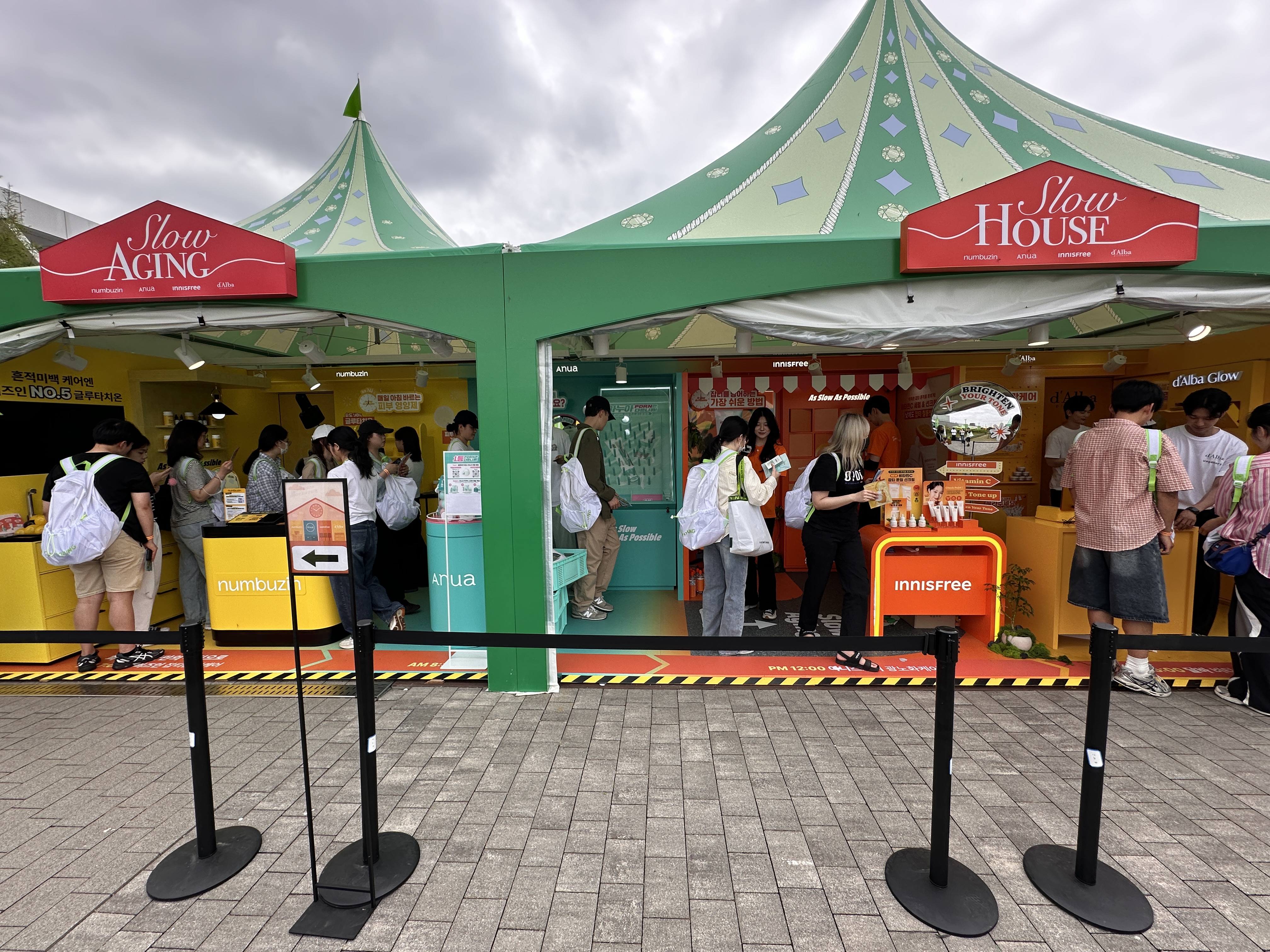 슬로우하우스 부스는 넘버즈인, 아누아, 이니스프리, 달바 네 개 브랜드가 연합해 차렸네요. 모두 인기 브랜드인 만큼 대기줄이 매우 길었답니다.