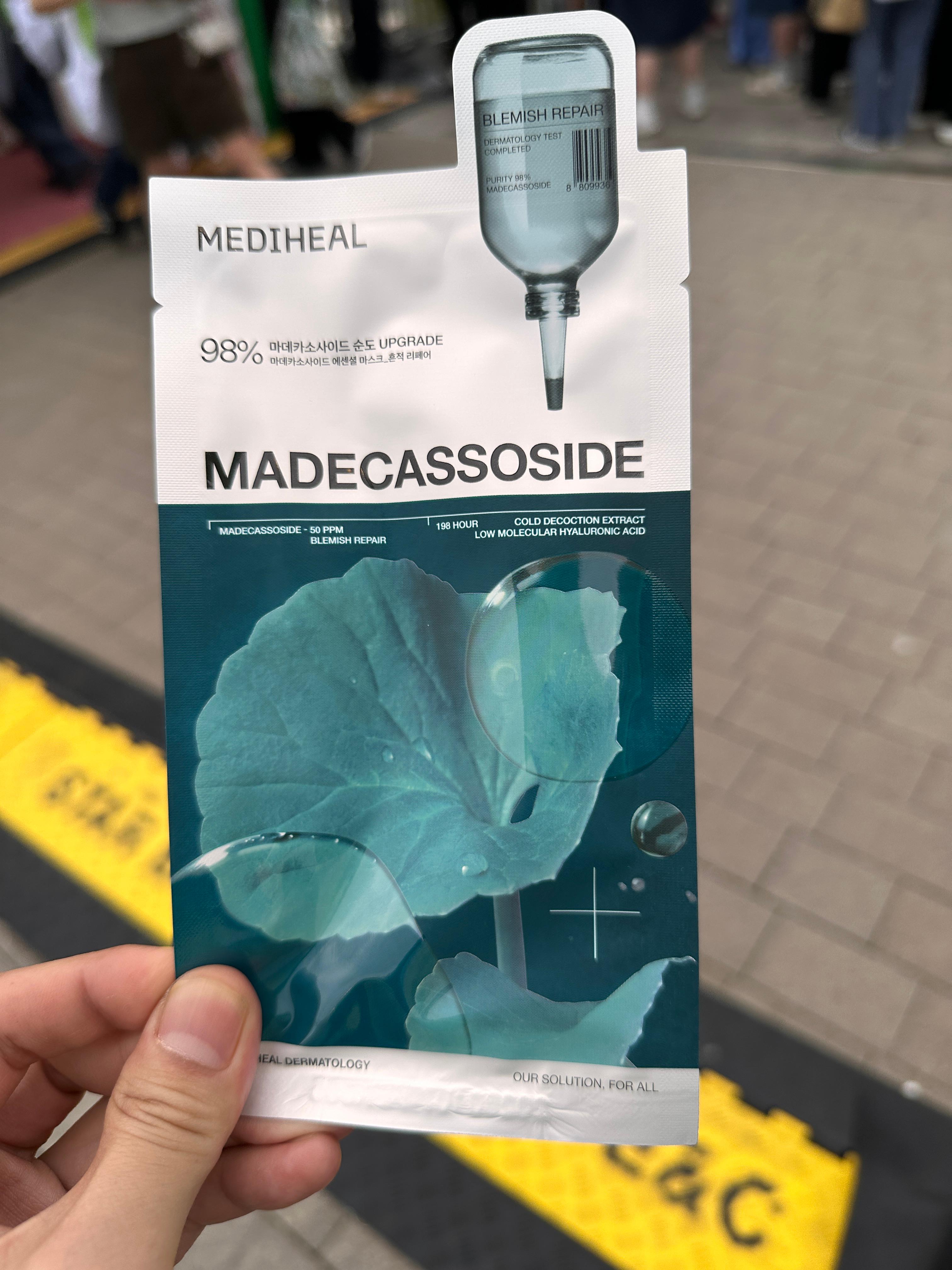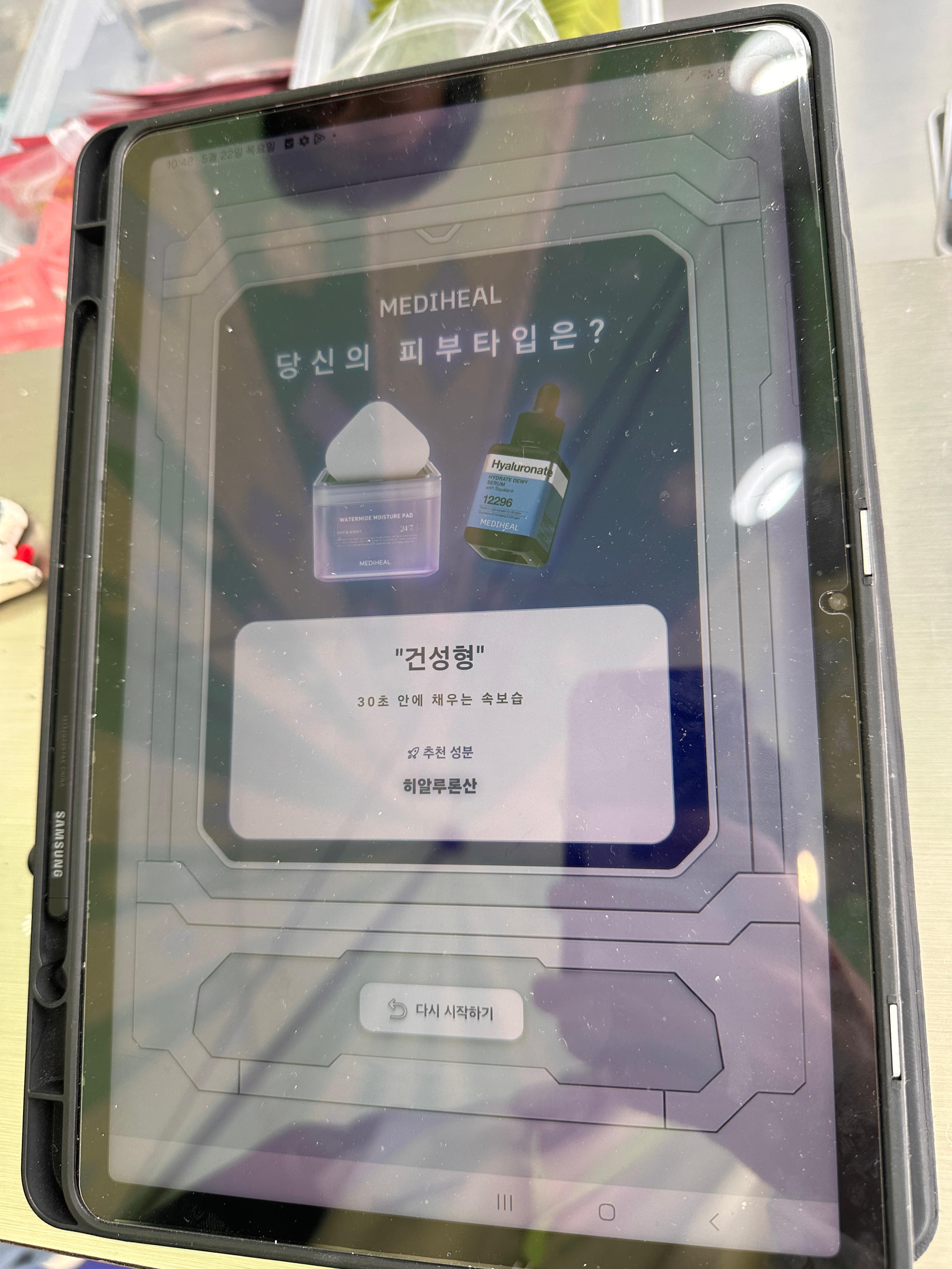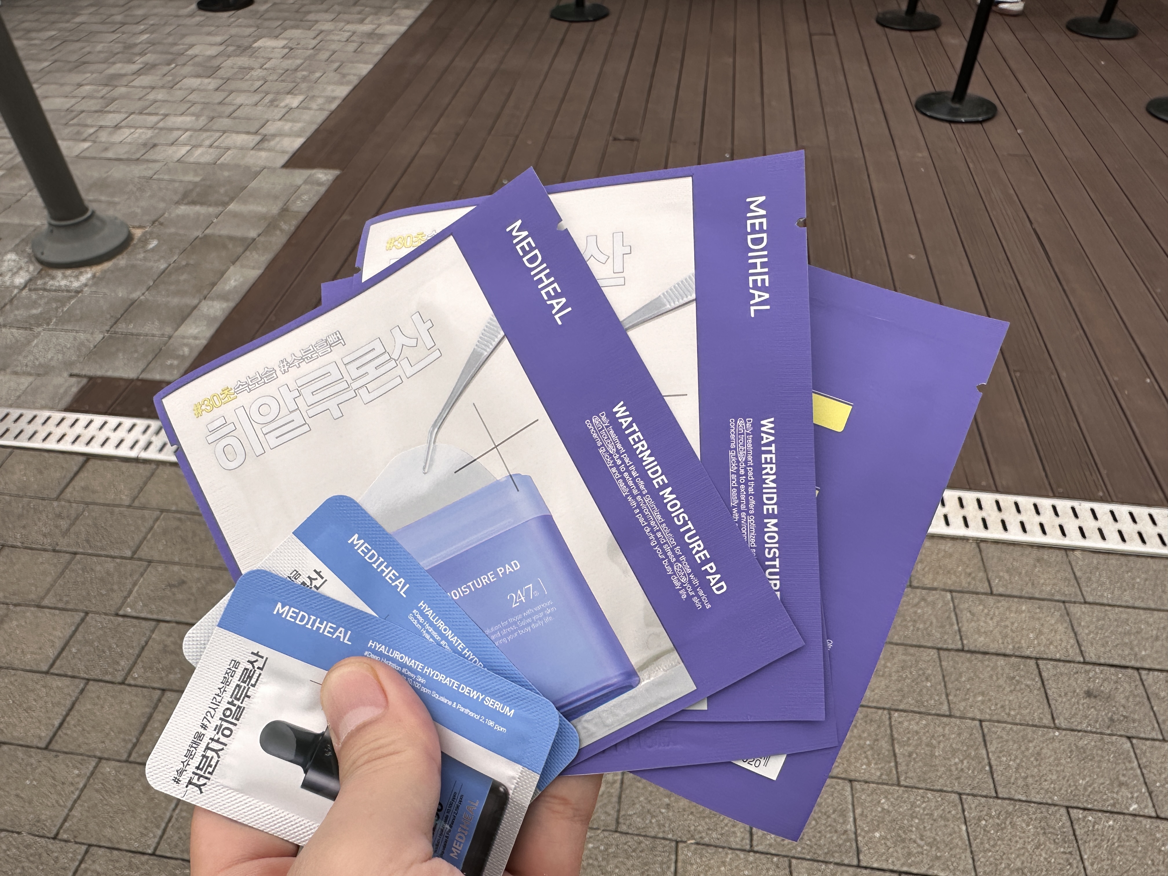 메디힐 부스에서는 피부 타입을 체크하는 체험도 할 수 있었는데요. 건성 피부에 좋은 히알루론산 수분 패드와 세럼 샘플을 여러 개 받았답니다.