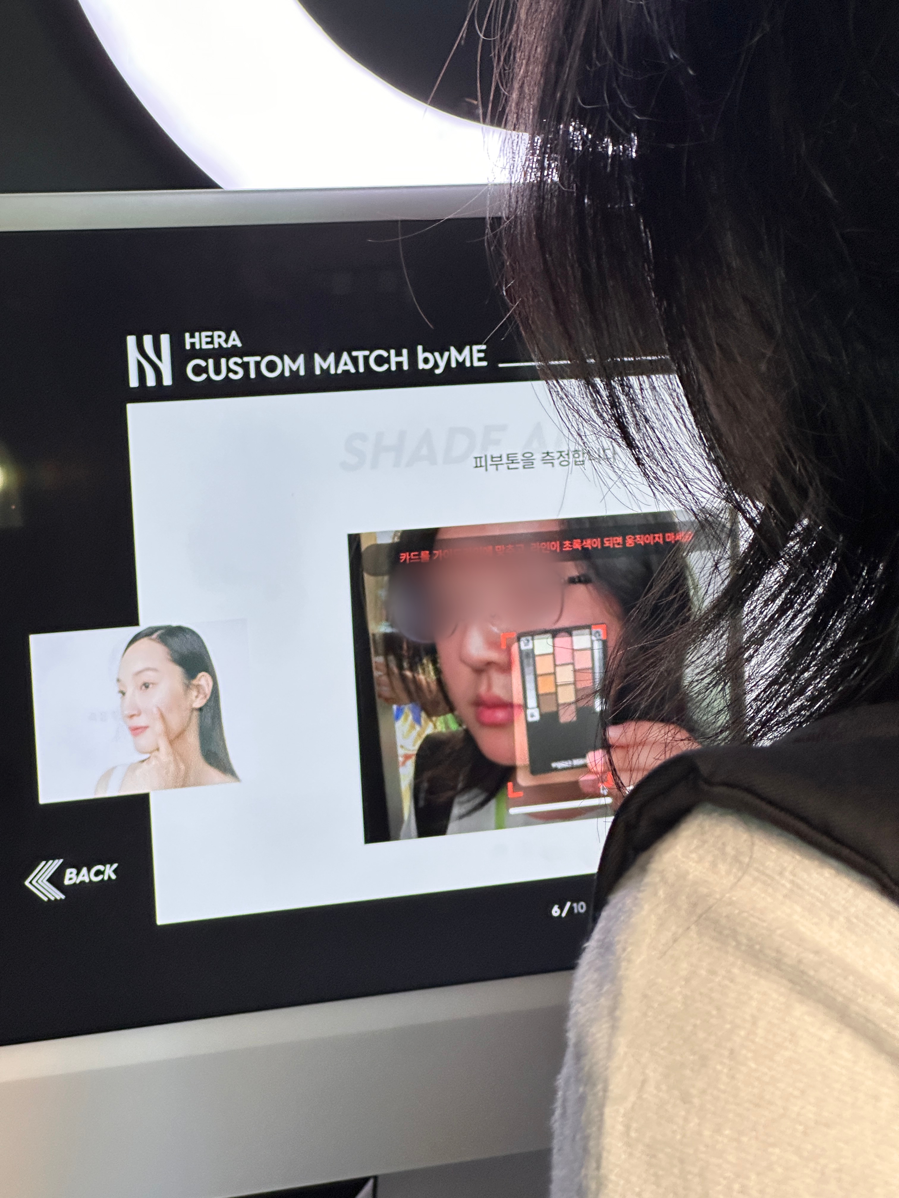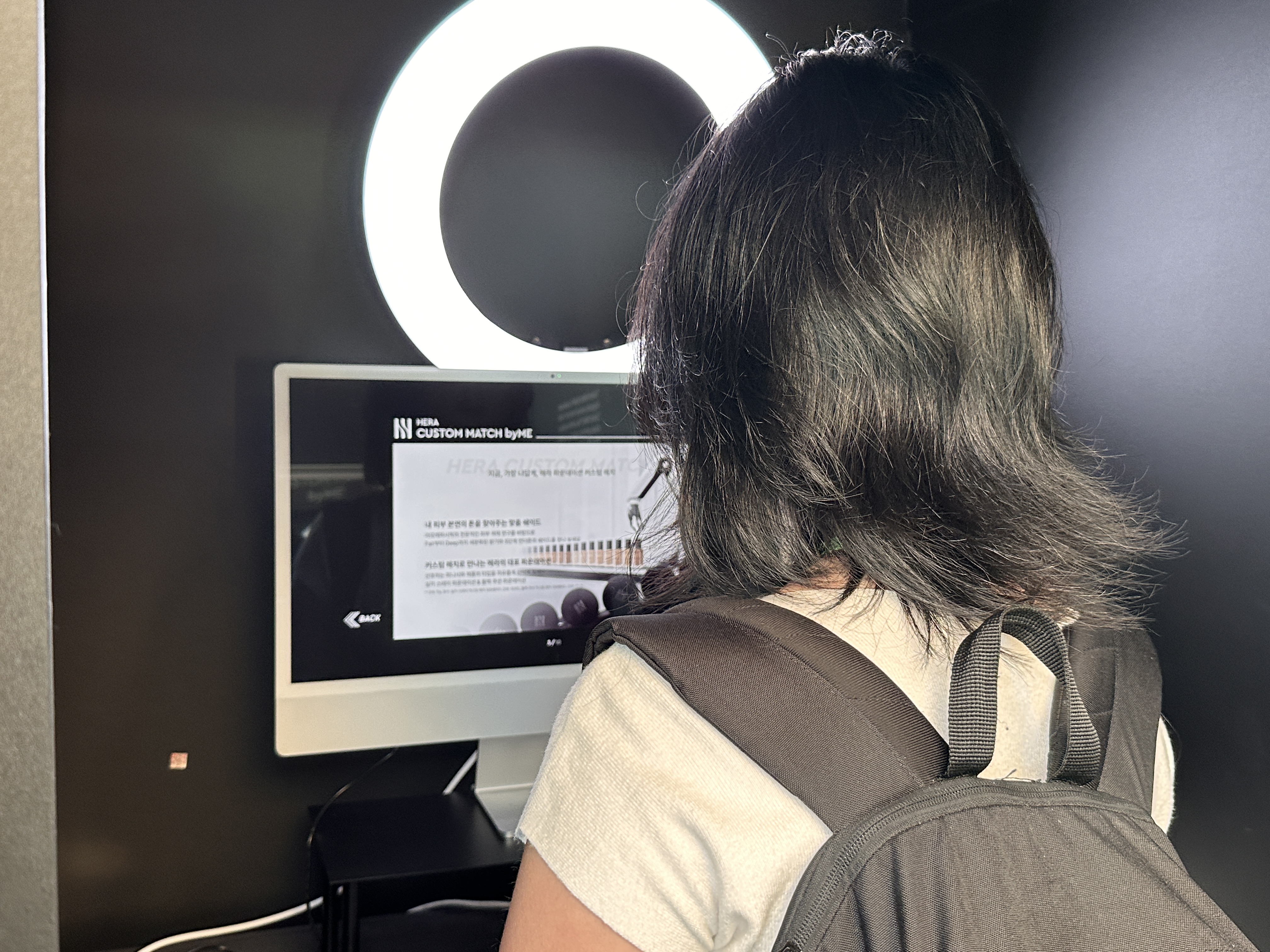 마지막으로는 계속해서 줄이 길다 한순간 줄이 줄어든 럭스에디트 존에 입성했는데요. 부스 내부 기기 카메라에 얼굴을 대고 컬러칩을 대서 퍼스널 컬러를 측정하는 서비스를 하고 있었어요. 에디터도 해봤는데요.