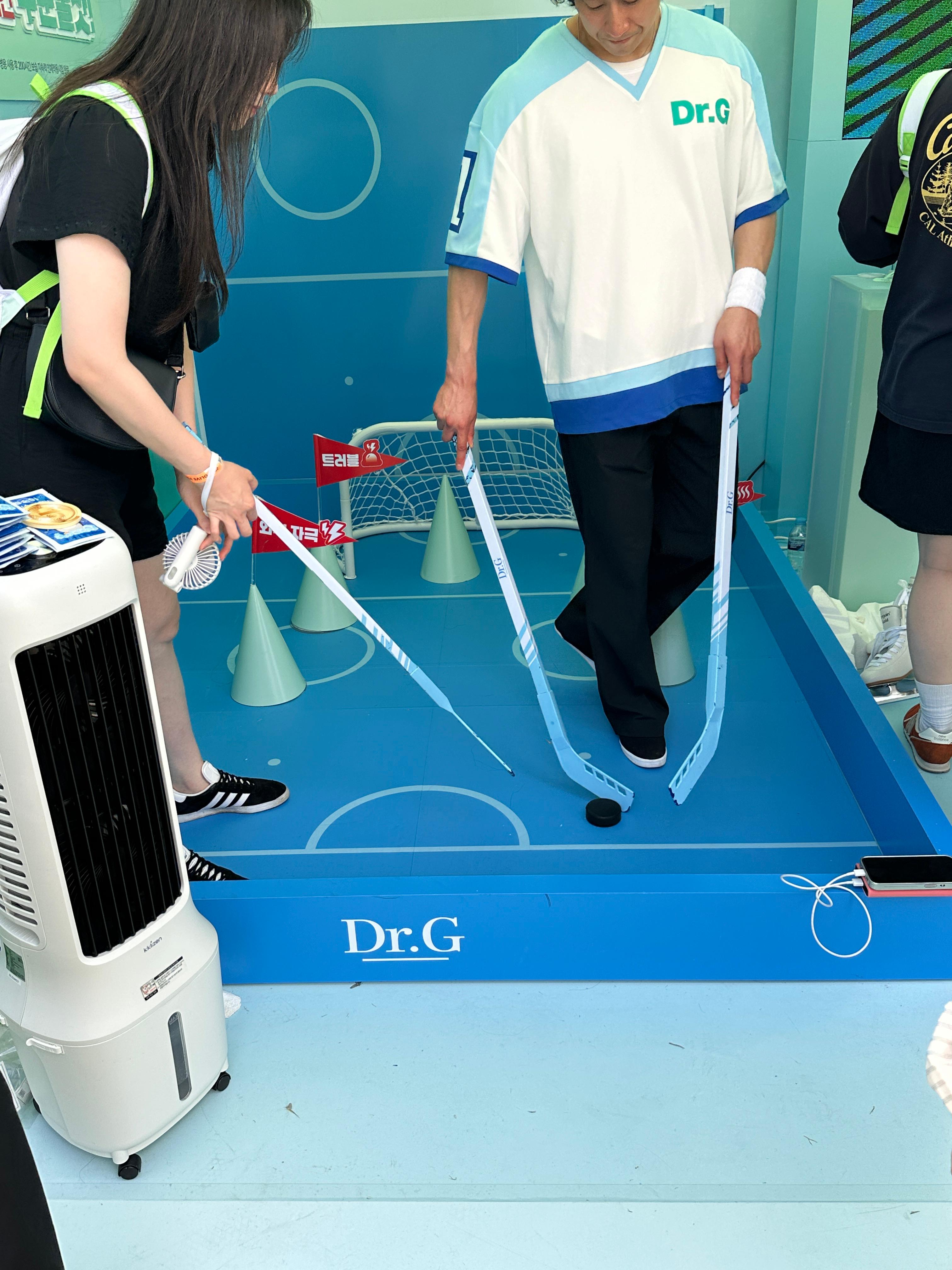닥터지 부스는 하키채로 골을 넣는 행사를 진행하고 있었어요. 에디터는 골 두 개를 넣고 나머지 하나는 너무 정확하게 친 나머지 골키퍼 역할의 콘에 막혔답니다.