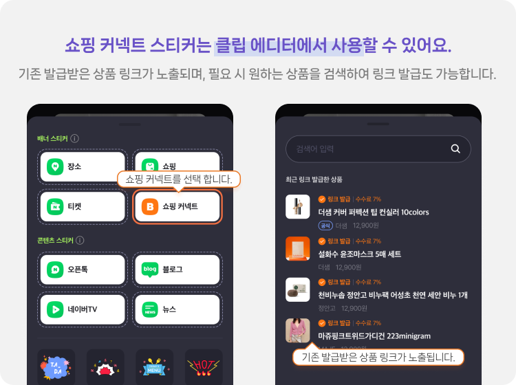 ✔︎1. 네이버 클립은 크리에이터가 상품 태그를 붙이는 방식을 사용합니다.