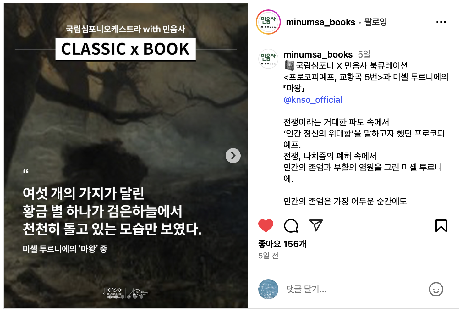 민음사는 이런 흐름에 발맞춰 국립심포니와 협업을 진행했습니다. '인간의 존엄'을 주제로 한 클래식 콘서트 <프로코피예프, 교향곡 5번>과 비슷한 주제를 다룬 문학 작품 <마왕>을 함께 큐레이션 했죠. 해당 이벤트에서 티켓과 도서를 패키지로 묶어 할인 판매하고, 민음사 멤버십이나 해당 도서를 소장한 독자에겐 할인 혜택을 제공했습니다. 즉, 클래식을 소비하는 과정에 책을 녹여낸 것이죠.