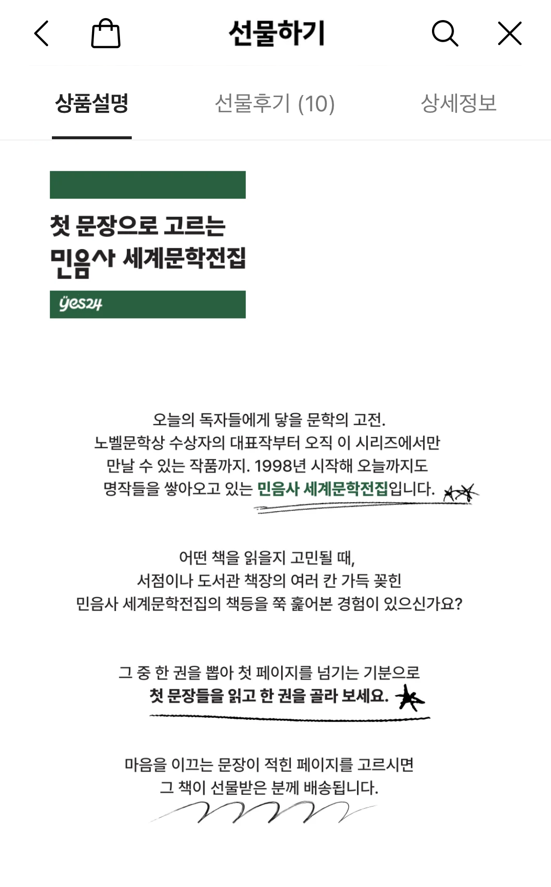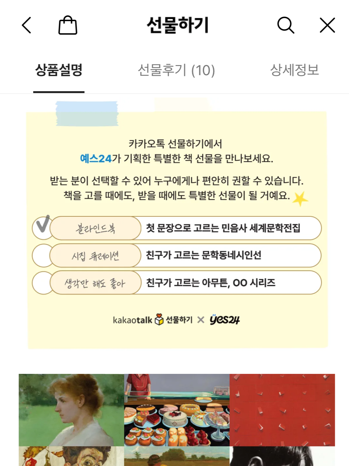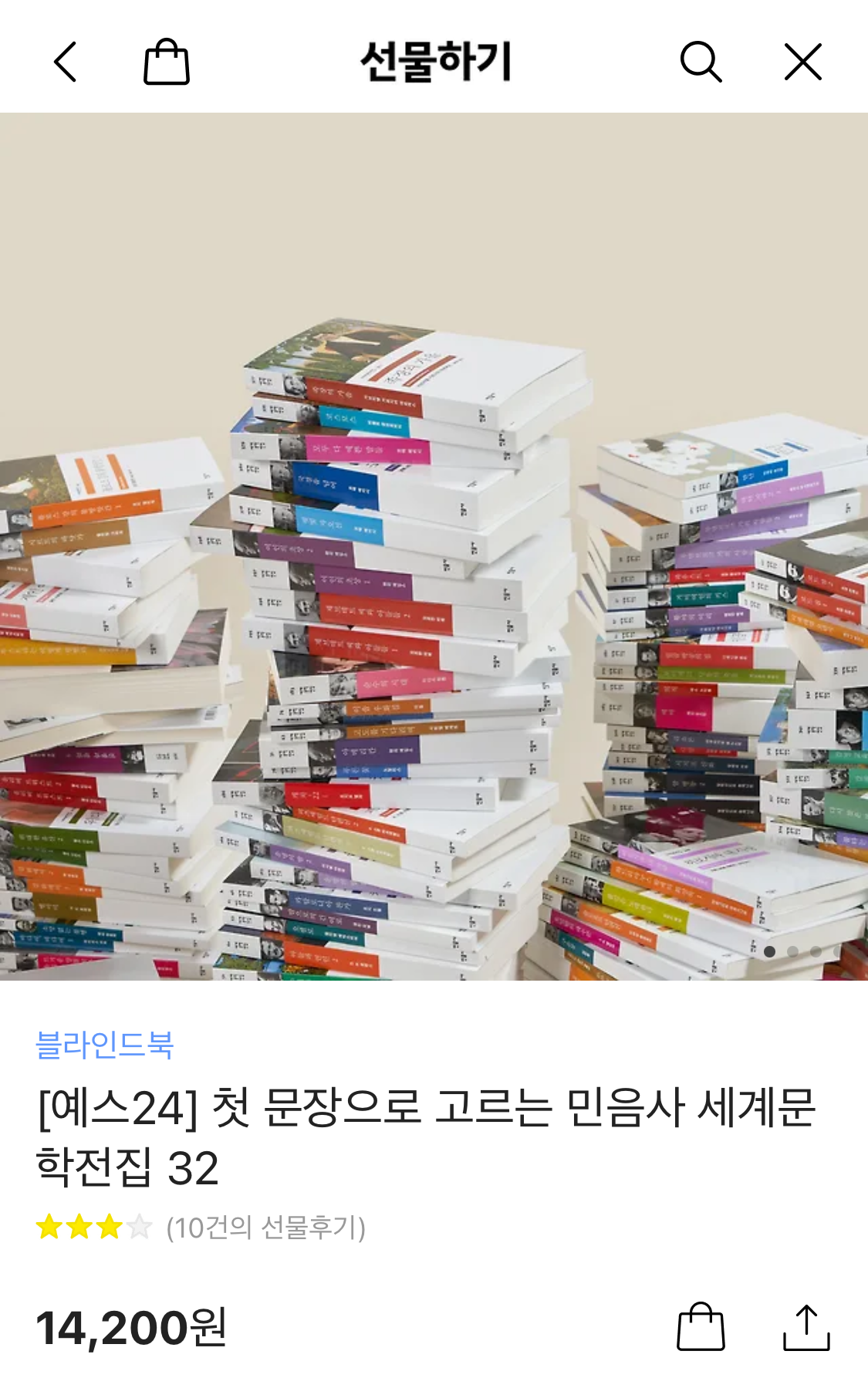 최근 예스24는 카카오톡 선물하기에서 '첫 문장으로 고르는 민음사 세계문학전집'이라는 블라인드북을 선보였습니다. 이 상품엔 제목도, 작가도, 책 소개도 없습니다. 오직 첫 문장만 읽고, 선물할 책을 골라야 하죠. 이 신선한 방식은 랜덤 콘텐츠를 즐기는 MZ세대의 취향을 저격했습니다. 실제로 X(구:트위터)에서 한 유저가 올린 블라인드북 게시물이 5천 회 이상 RT 될 정도였죠.