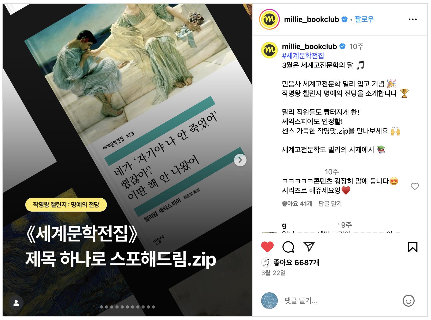 <작명왕 챌린지>는 고전 명작에 웹소설스러운 제목을 붙이는 참여형 이벤트입니다. 민음사 세계문학전집 시리즈가 밀리의 서재에 입고된 것을 알리기 위해 기획되었죠. 이벤트를 통해 '열녀 never cry'(『춘향전』), '여주 꼬시려다 파산핑이 되'(『위대한 개츠비』)와 같은 MZ 밈 감성의 스포일러 제목이 쏟아졌고, SNS상에서도 큰 화제를 모았죠.